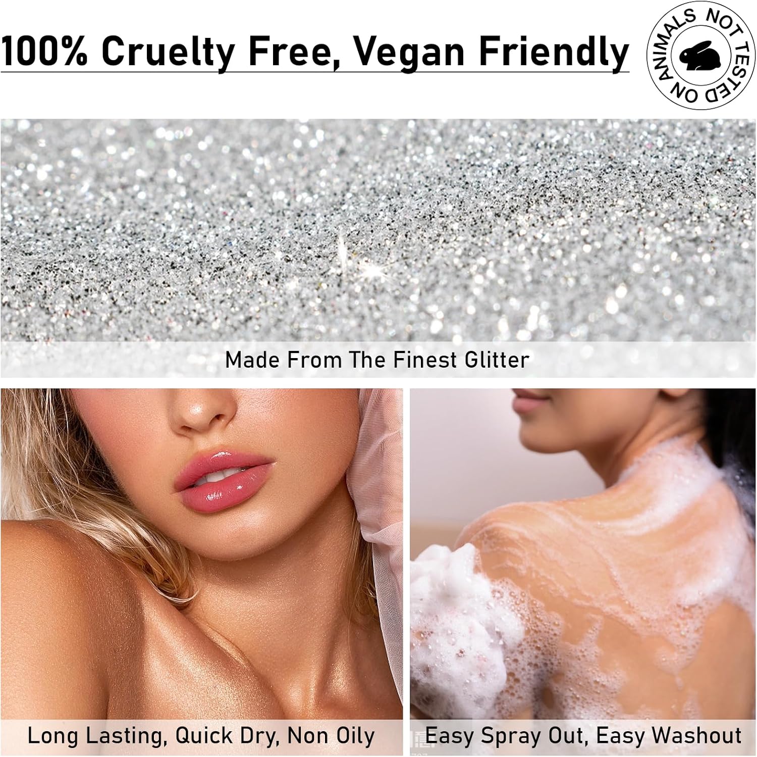 - Silver Glitter Spray: Silver shimmer spray can be used on the body, hair, and clothes to create a head to toe shimmering effect. Effectively enhances face and body contours with dimension and sparkle, matching perfectly with any makeup and outfit. Long-lasting sparkle, fast drying, non oily and non sticky.