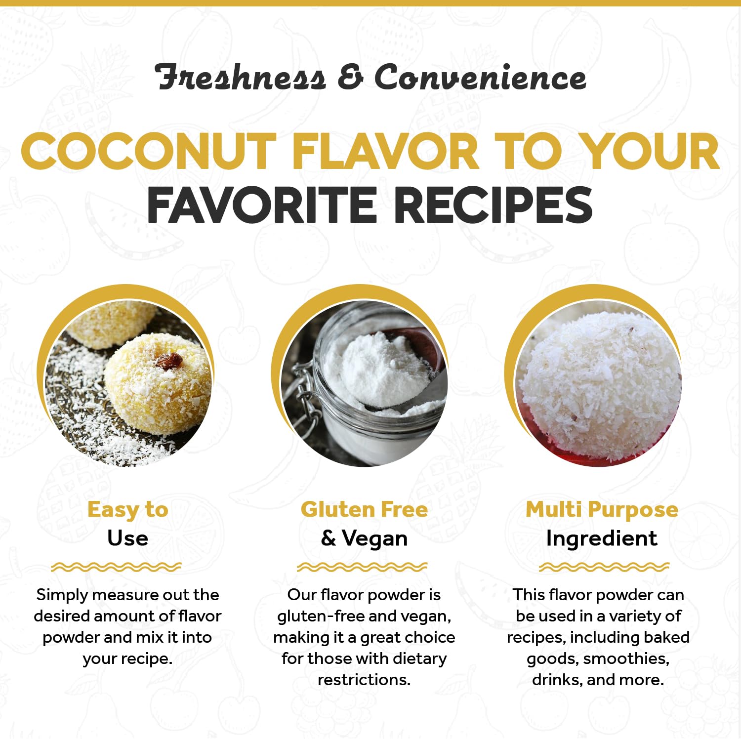 - 𝐄𝐚𝐬𝐲 𝐭𝐨 𝐮𝐬𝐞:Simply measure out the desired amount of Coconut flavor powder and mix it into your recipe. No need to chop, grind, or blend Coconut, as this powder provides all the nutty flavor you need in a convenient form.