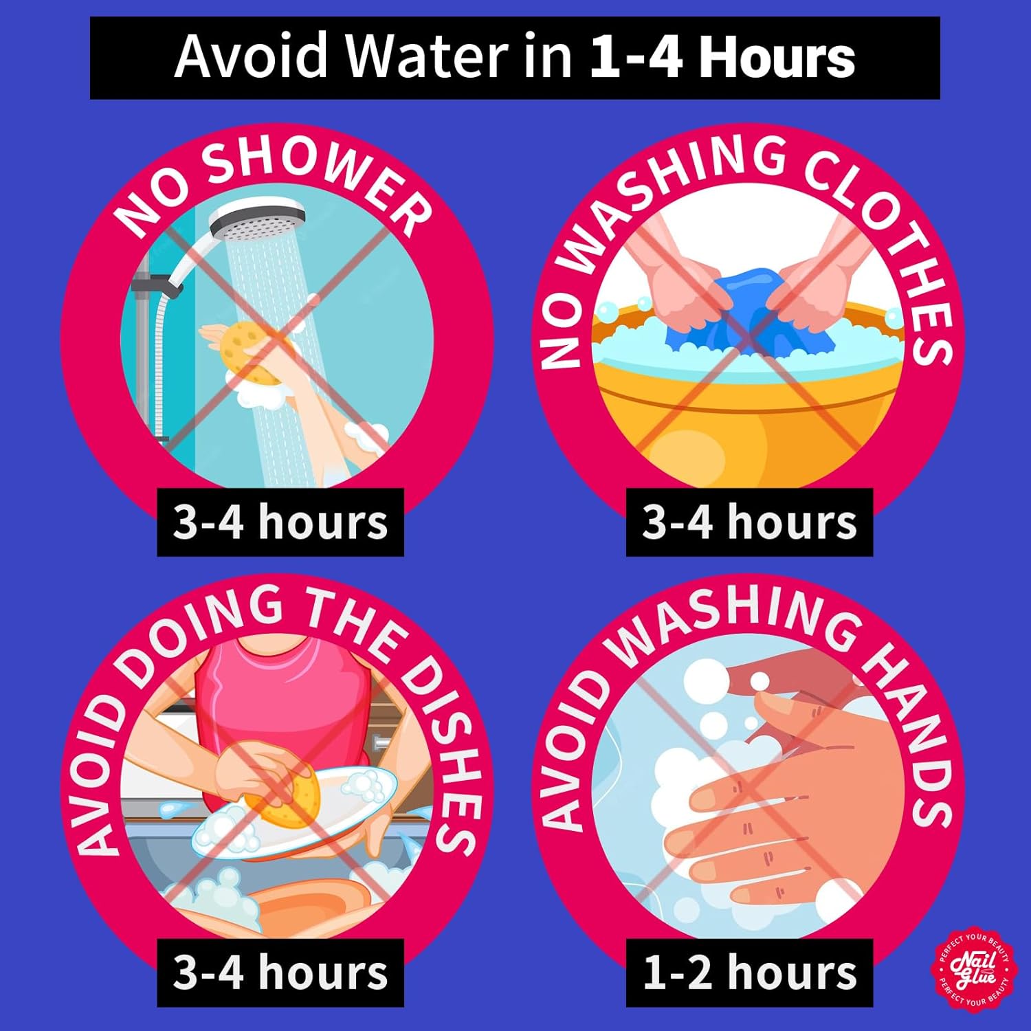 - Tips for Better Stickiness & Longer Lasting: Please avoid touching water in 1-4 hours, especially take a shower, wash clothes or do the dishes, avoid washing your hands in 3 hours after applying press on nail glue; you can use nail file to file your nail bed to make it rough then apply nail glue will get better stickiness