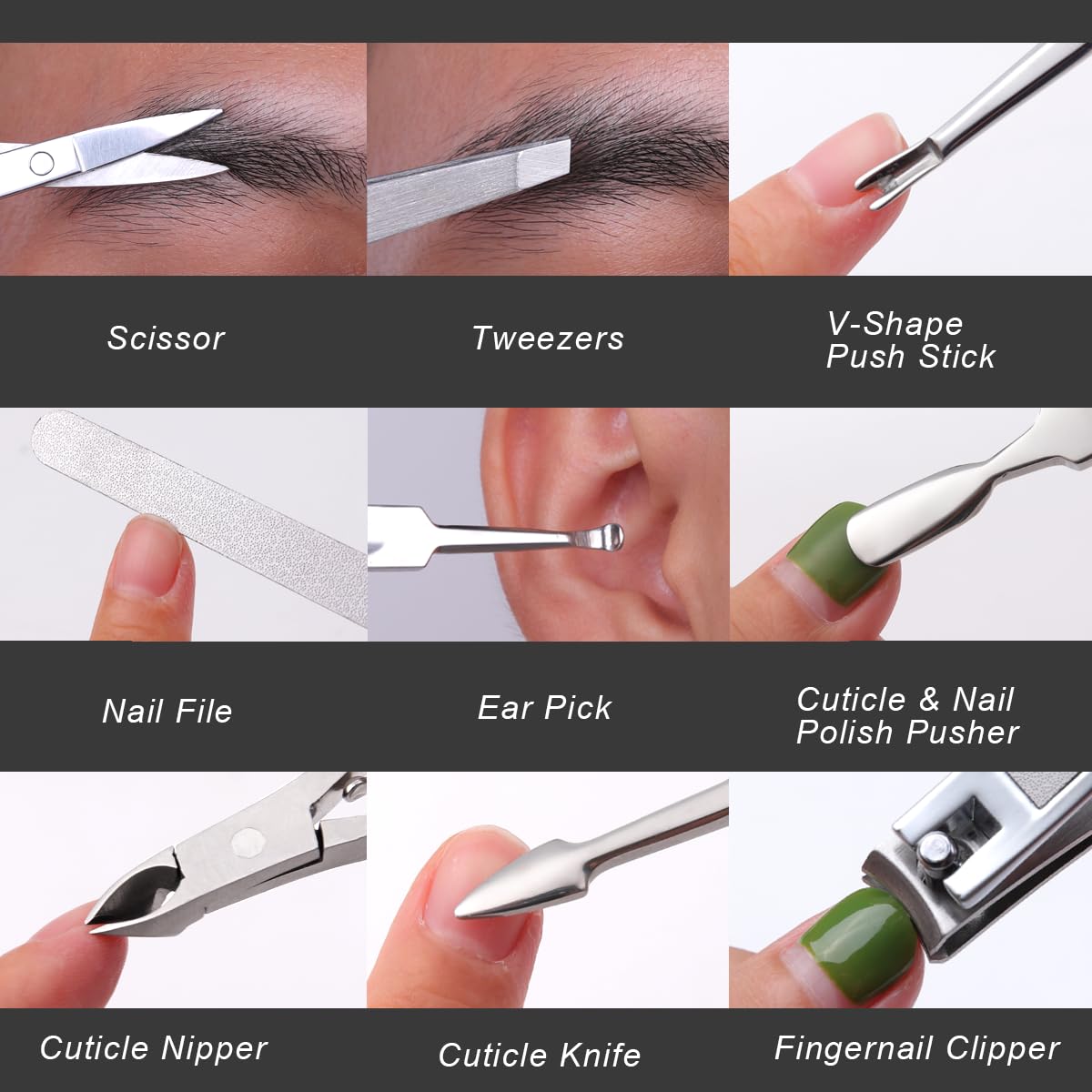 - 【Multi-Functional Manicure Set】 Our manicure kit contains 11 pieces of nail and toenail tools to meet all your hand care, facial, and foot care needs. The nail clipper set suitable for all shape of nails. Manicure set can be a gift for him or her. The best gifts for festivals, such as Christmas, Thanksgiving Day, Fathers' Day and so on.