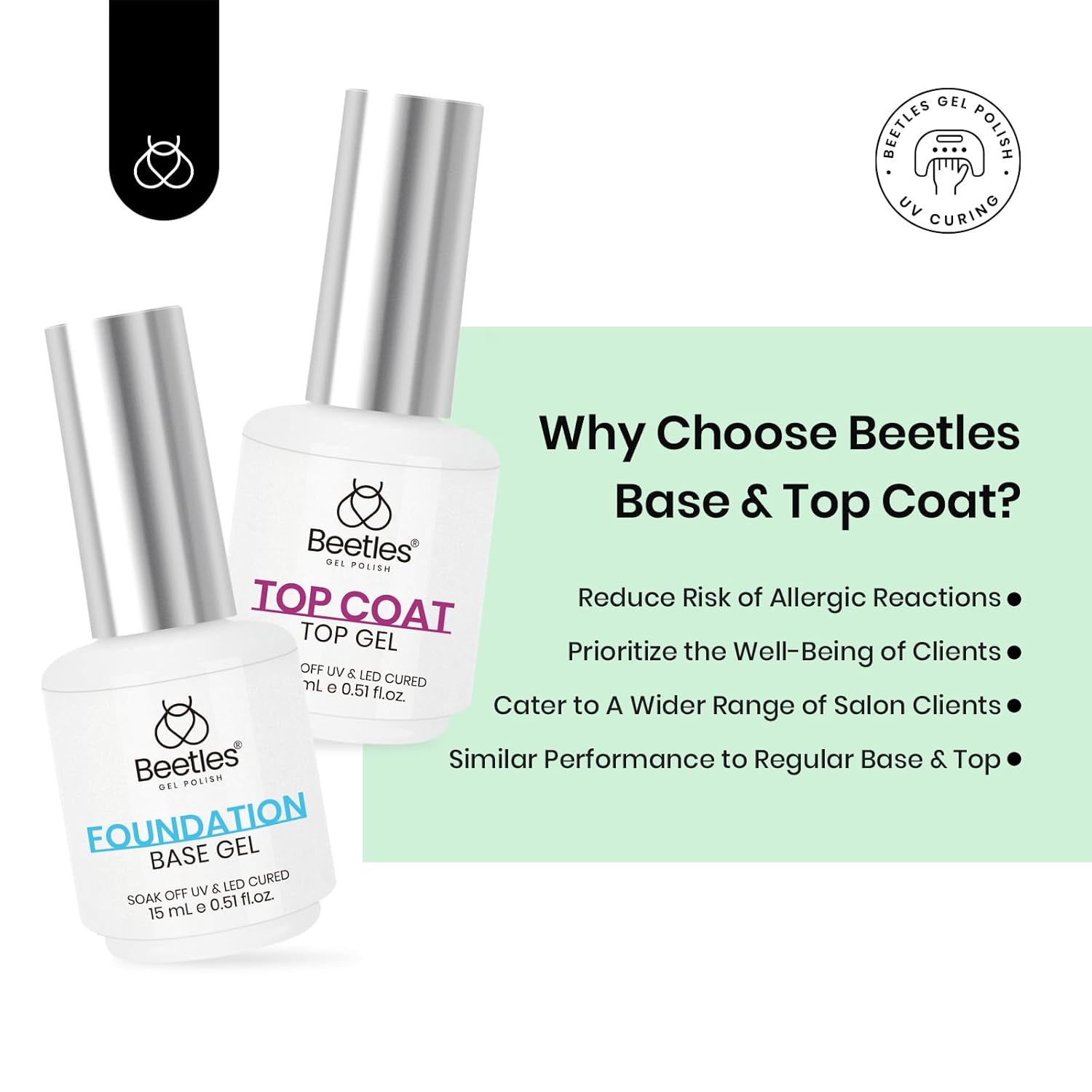 - Hema-Free Gel Base and Top Coat Set: Beetles launches a new HEMA-free gel base coat and top coat set with healthier ingredients. You don’t have to worry about HEMA allergies when doing a manicure, providing a safe and healthy nail care experience. Please read the product ingredient list and instructions carefully. If you have any questions, contact us to help you. Tips: Avoid touching your nails after curing the top coat for 2 minutes to enhance the shine.