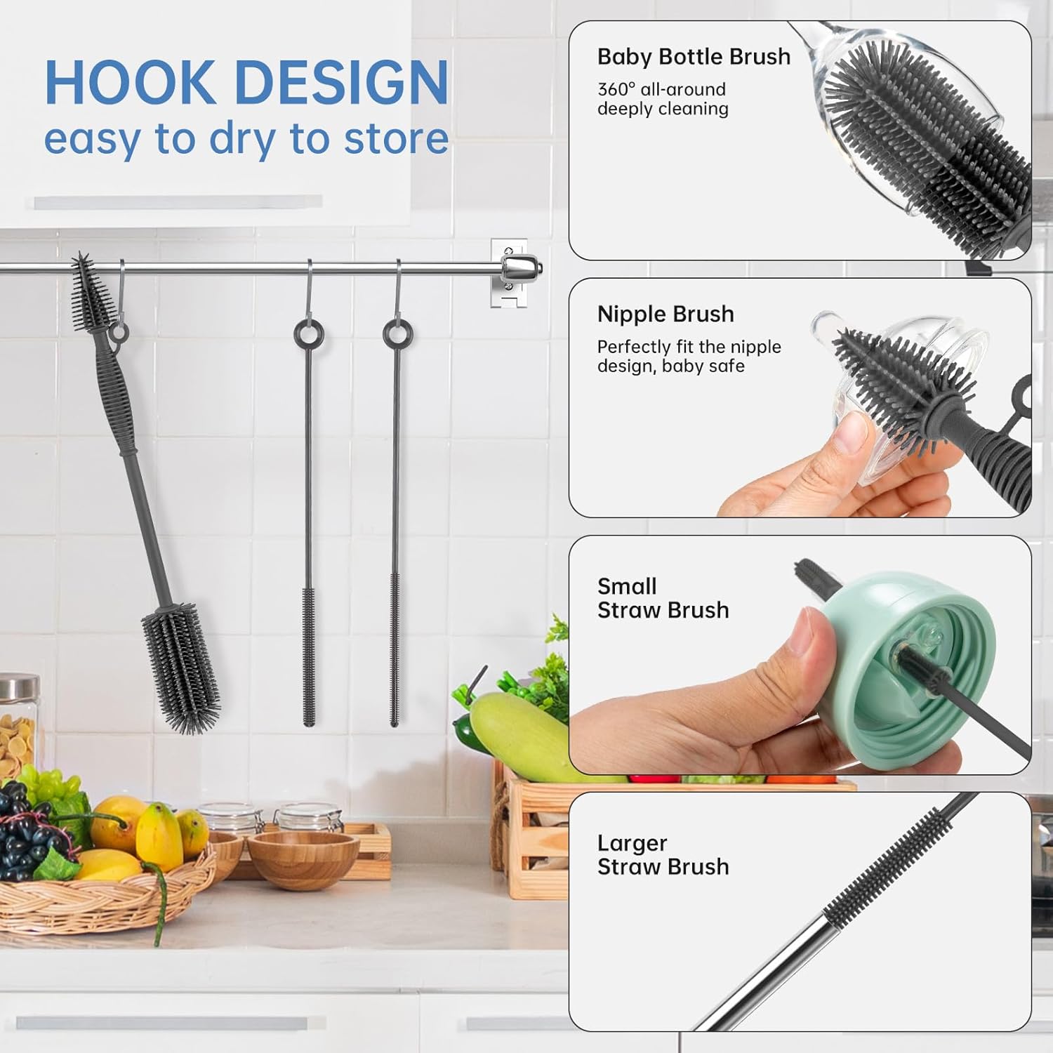 - Complete Baby Bottle Brush and Straw Cleaner Brush Set: In addition to the bottle brush, this set also includes two silicone straw cleaner brushes for complete cleaning coverage. This sturdy and flexible set reaches deep inside containers and straws for total cleanliness
