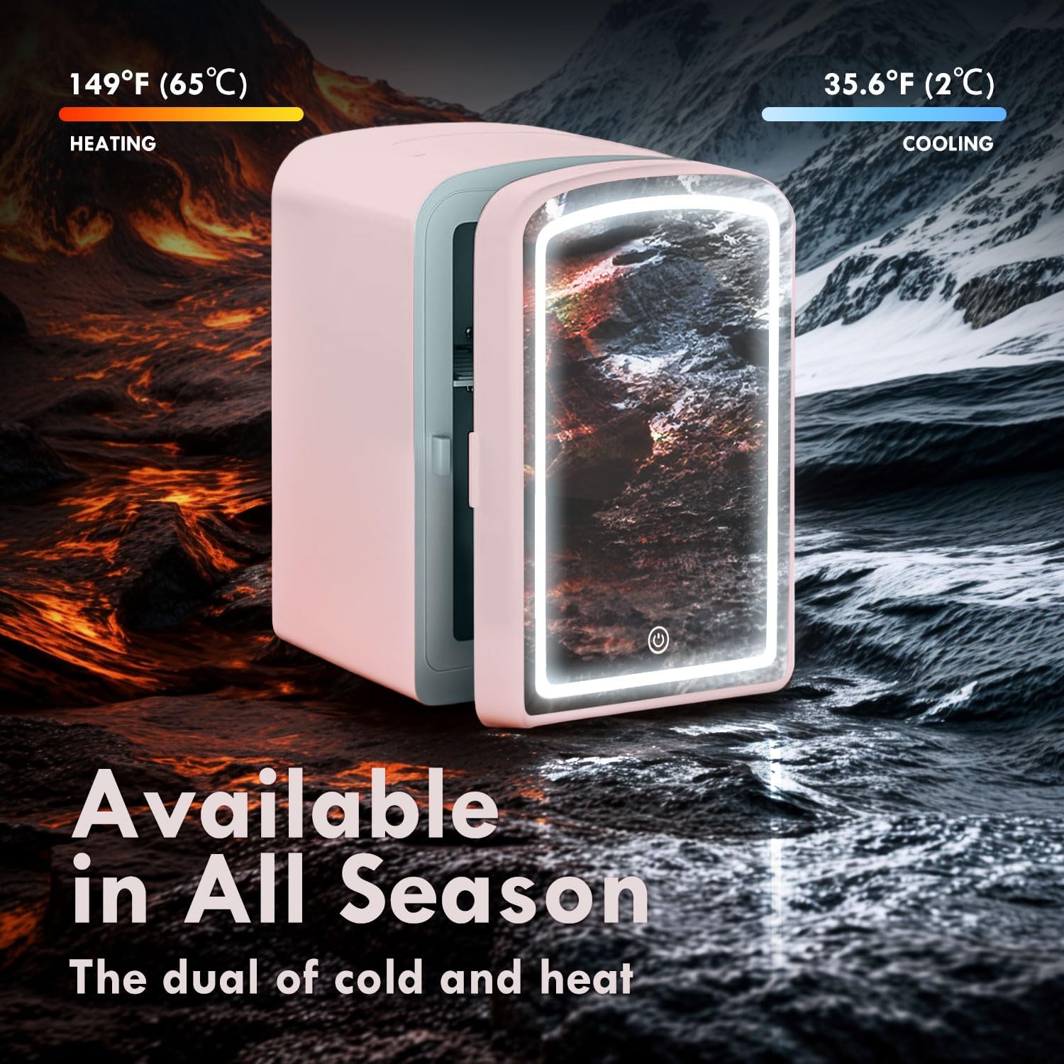 Mini Fridge for Skin Care, 4 Liter Portable Small Fridge with Dimmable LED Mirror, Hot or Cold Personal Beauty Refrigerator for Bedroom, Office, Car, Makeup(Pink)