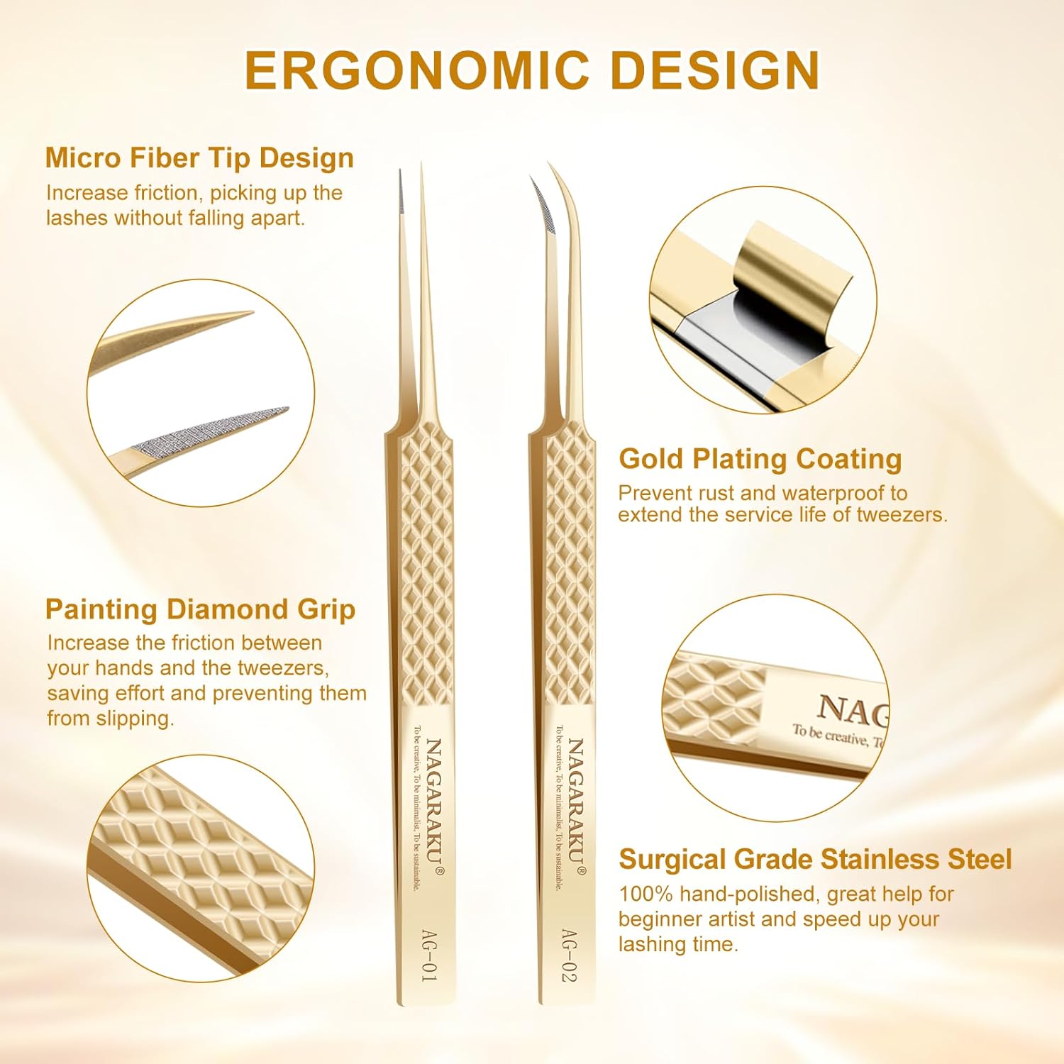 - 【AG-01+AG-02】Set of straight tweezers and curved tweezers. These handcrafted tweezers are made of high-strength stainless steel, which is resistant to most acids and other corrosive agents. We give each tweezer a box to protect the tweezers.