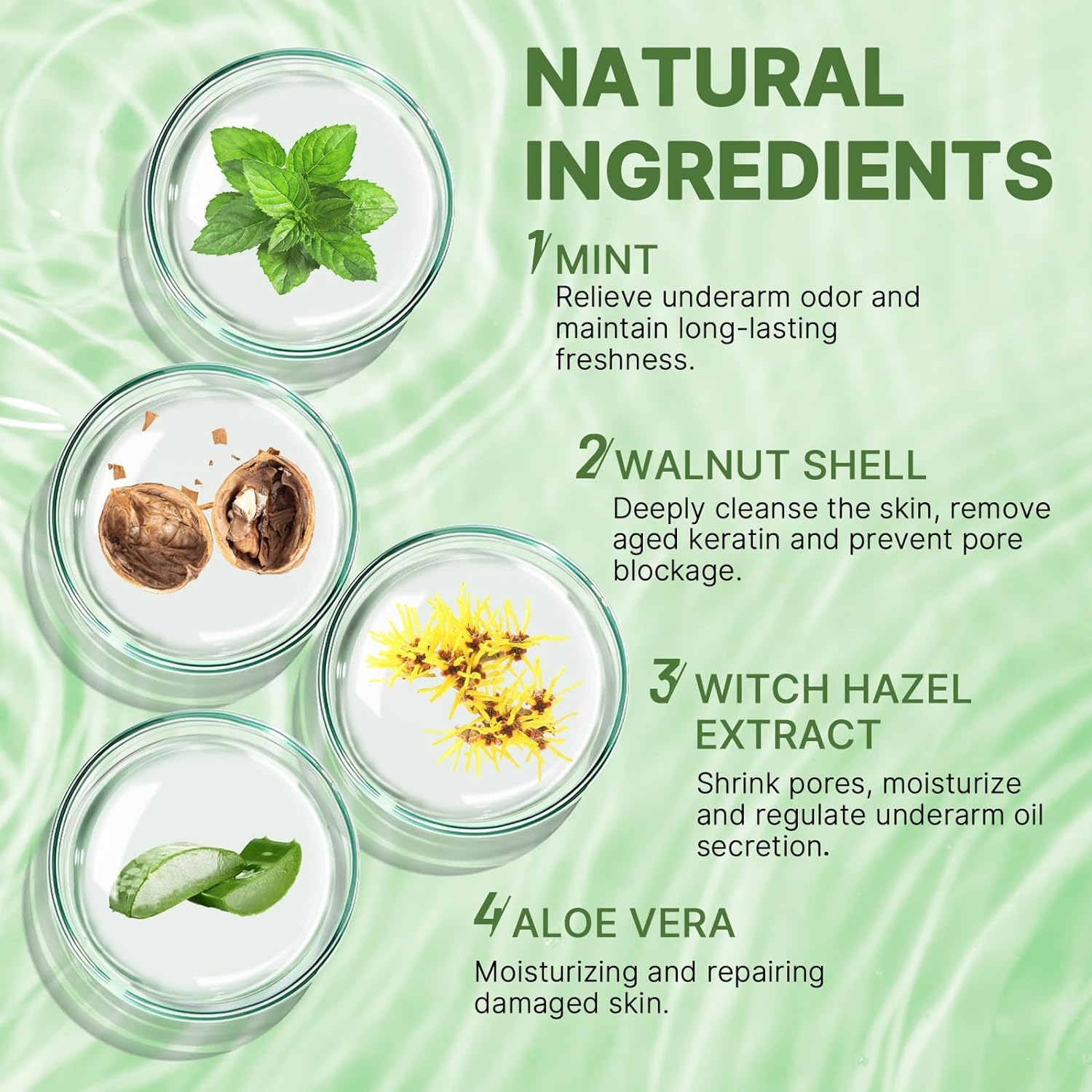 - 【Safty】Our scrubs is safe, made with high-quality mint extract, aloe vera, walnut shell powder, and witch hazel extract. It is a gentle exfoliator that helps remove underarm buildup and alleviate pore blockage.