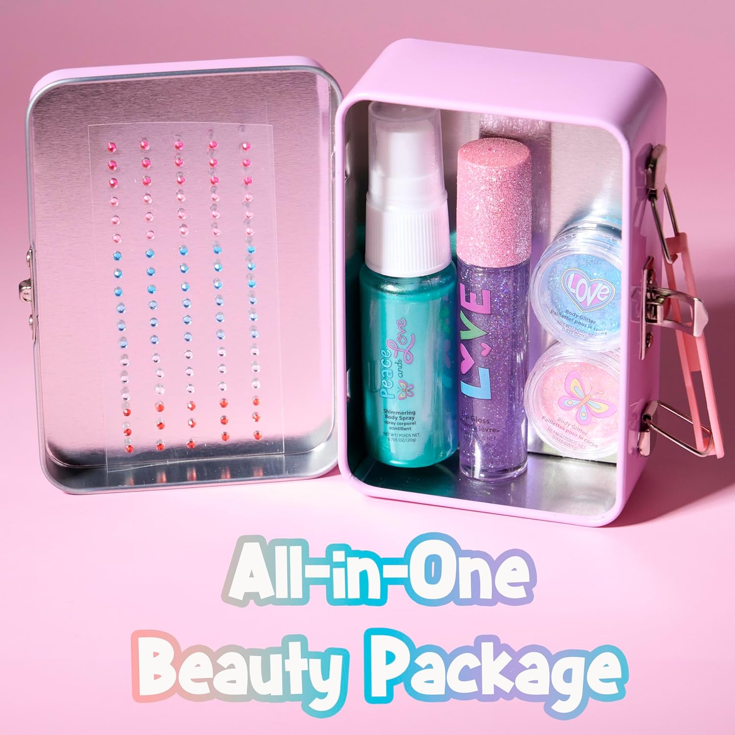 Expressions 6pc Peace & Rhinestones Beauty Set w/Tin Box Storage Case - Body Spray, Body Glitter, Mini Body Gems, and Lip Gloss Set,Washable + Non Toxic