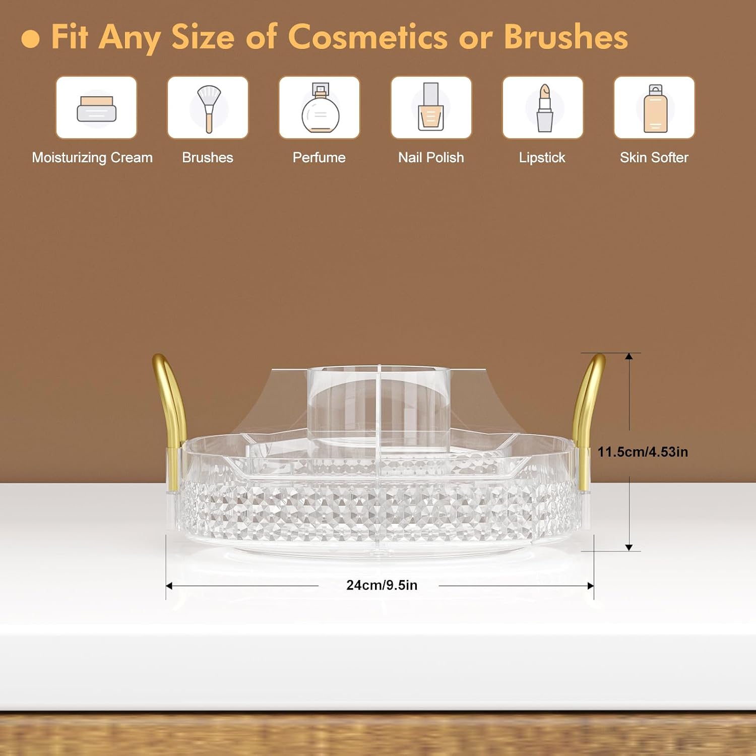 - Multifunction:➤The spinning organizer can be used to store cosmetics, such as:perfume, brushes,nail polish, lipstick,eye shadow,makeup powder, or store bathroom supplies, such as:toothbrush, toothpaste,razor,body lotion.You can use non-compartmented plates as food display plate to store vegetables, fruits, pastries, snacks, etc, or store condiments.