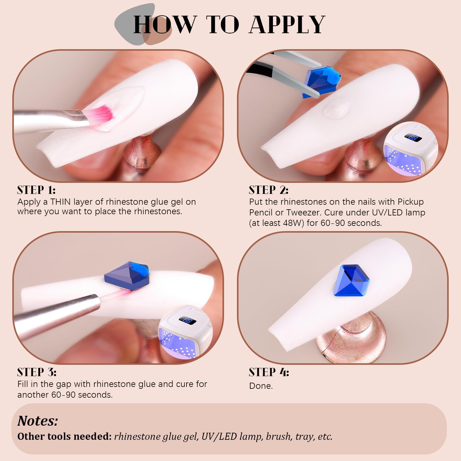 - 💎EASY TO USE -- Easy to apply on artificial nails. After applying nail polish and applying enough gel on the nails, simply use the equipped tools (pickup pen + tweezers) to pick up the crystals onto your nails to create your fabulous DIY designs! These crystals gemstones are different from those hotfix stones, they are not self-adhesive, you have to apply glue to stick them (glue is not included.)
