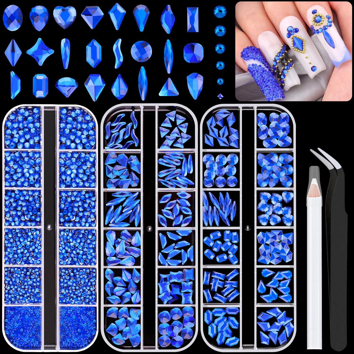 - 💎PACKAGE CONTENT -- The package contains 240Pcs multi shapes flatback gems crystal and 2510Pcs 1.5-4mm round beads, totally 2750Pcs Royal Blue rhinestones. Additionally, 1 tweezers for large size gems and 1 pickup pen for small size gems. This rhinestones kit makes it easy for you to make any nail art you like, and will bedazzle your acrylic nails!