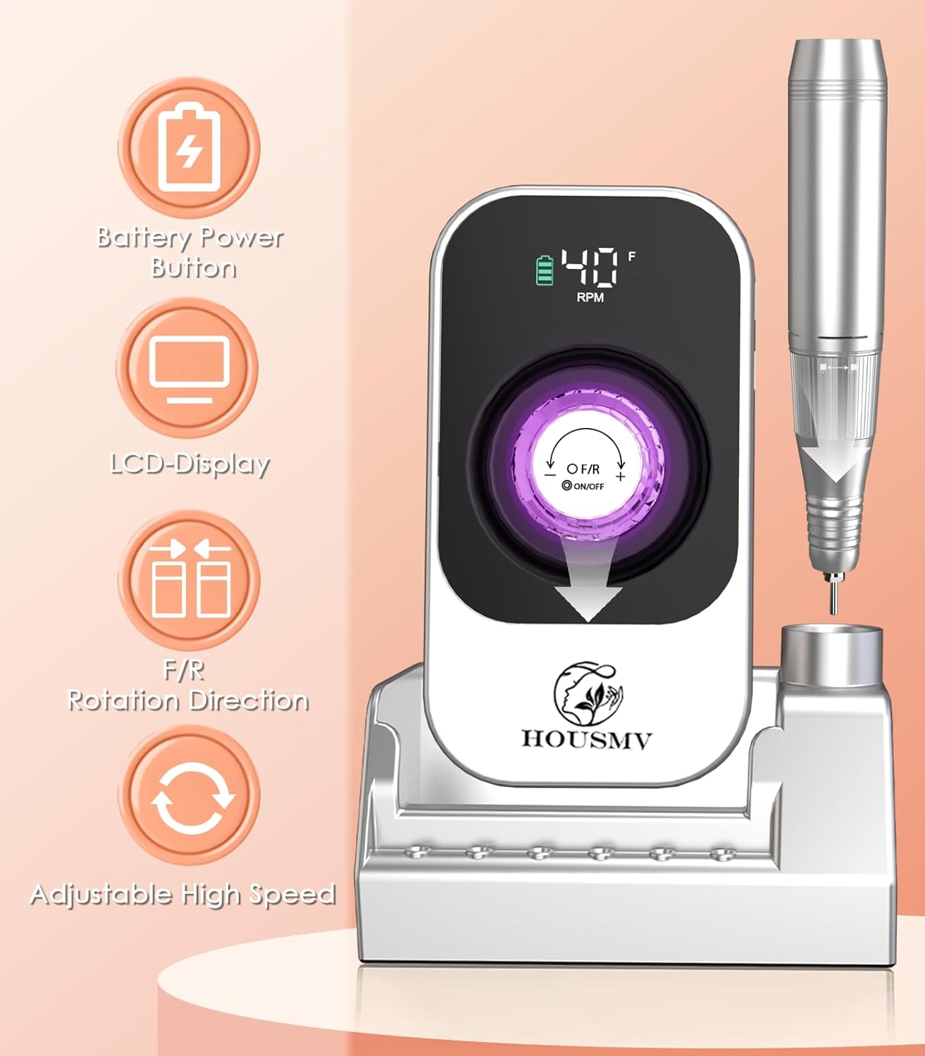 - 𝐋𝐨𝐧𝐠-𝐥𝐚𝐬𝐭𝐢𝐧𝐠 𝐁𝐚𝐭𝐭𝐞𝐫𝐲 𝐋𝐢𝐟𝐞: Our rechargeable nail drill features a large capacity battery, which offers 8-10 hours of usage just on 3 hours charge. The well-designed intelligent LCD display shows the rotation direction, speed, and remaining battery level, allowing you to conveniently adjust the speed and stay informed about the battery status.