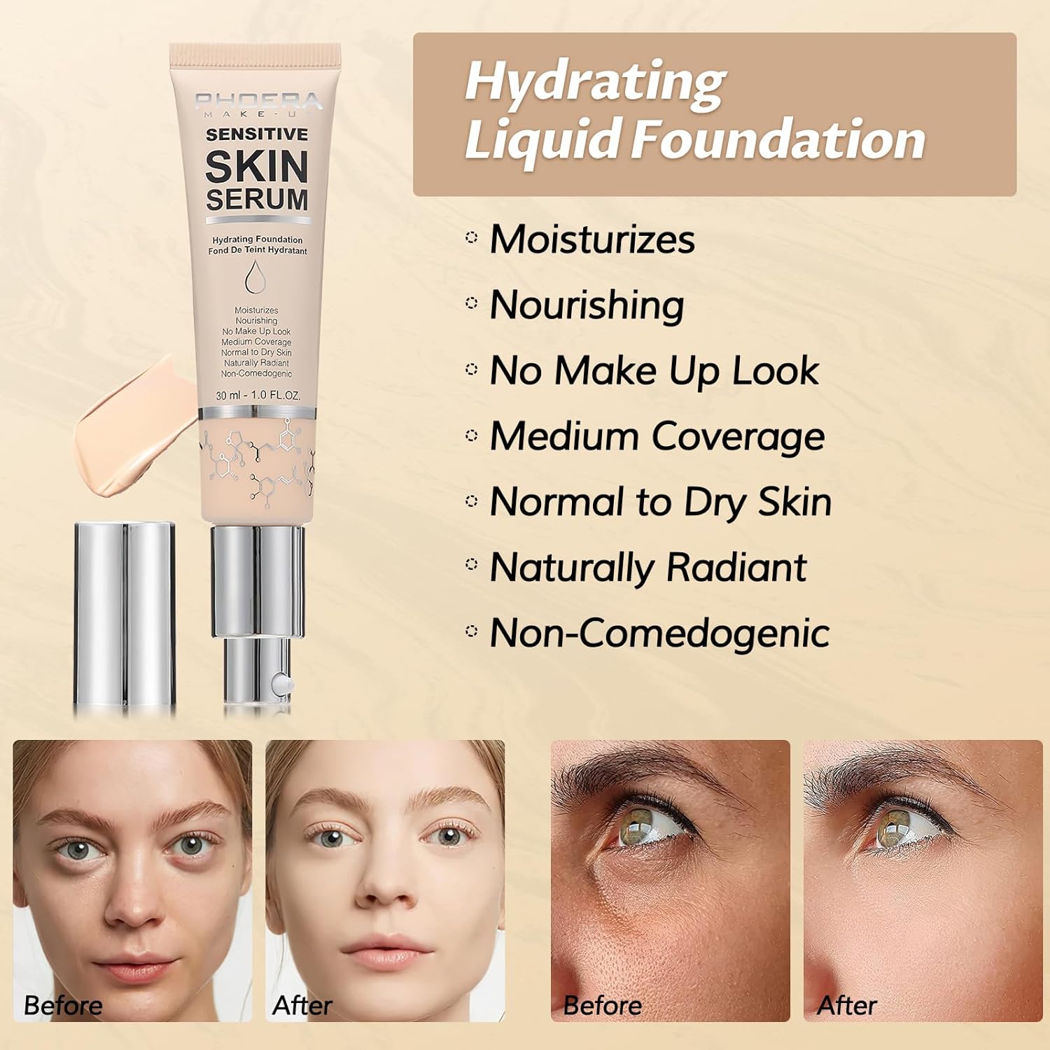 - [Natural Foundation]The serum foundation contains a blend of natural ingredients,which work together to hydrate and nourish the skin.Great for smoothing, illuminating, and minimizing pores prior to cosmetics.A Base for Your Beauty Regimen.