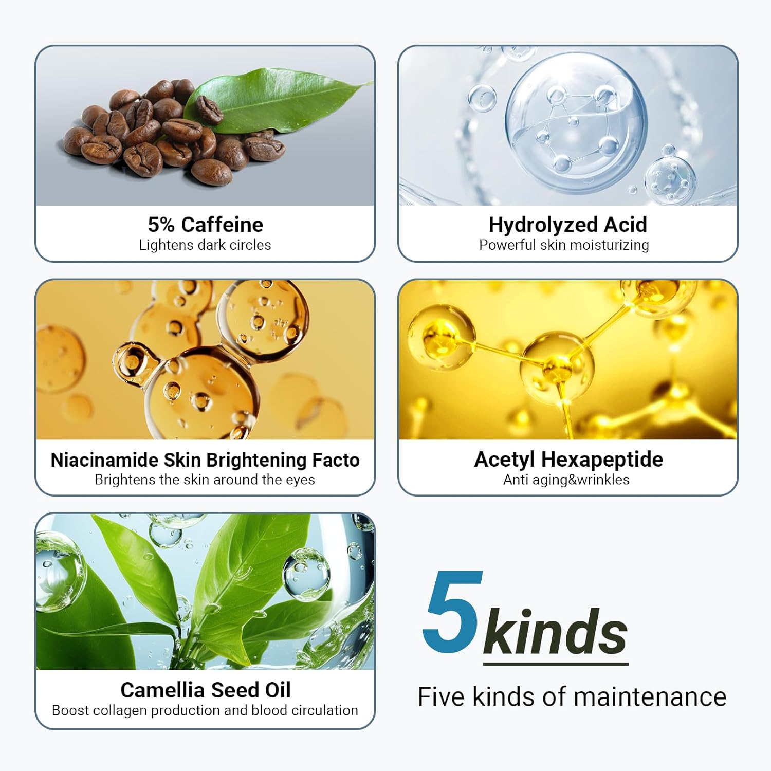 - 5% Caffeine Eye Serum: Hicream 5% Caffeine Under Eye Serum is effective on Dark Circles, Puffiness, Wrinkles and Fine Lines, deeply hydrates, visibly smooths and firms delicate skin around eyes. It is a very good eye cream for puffiness and bags under eyes.