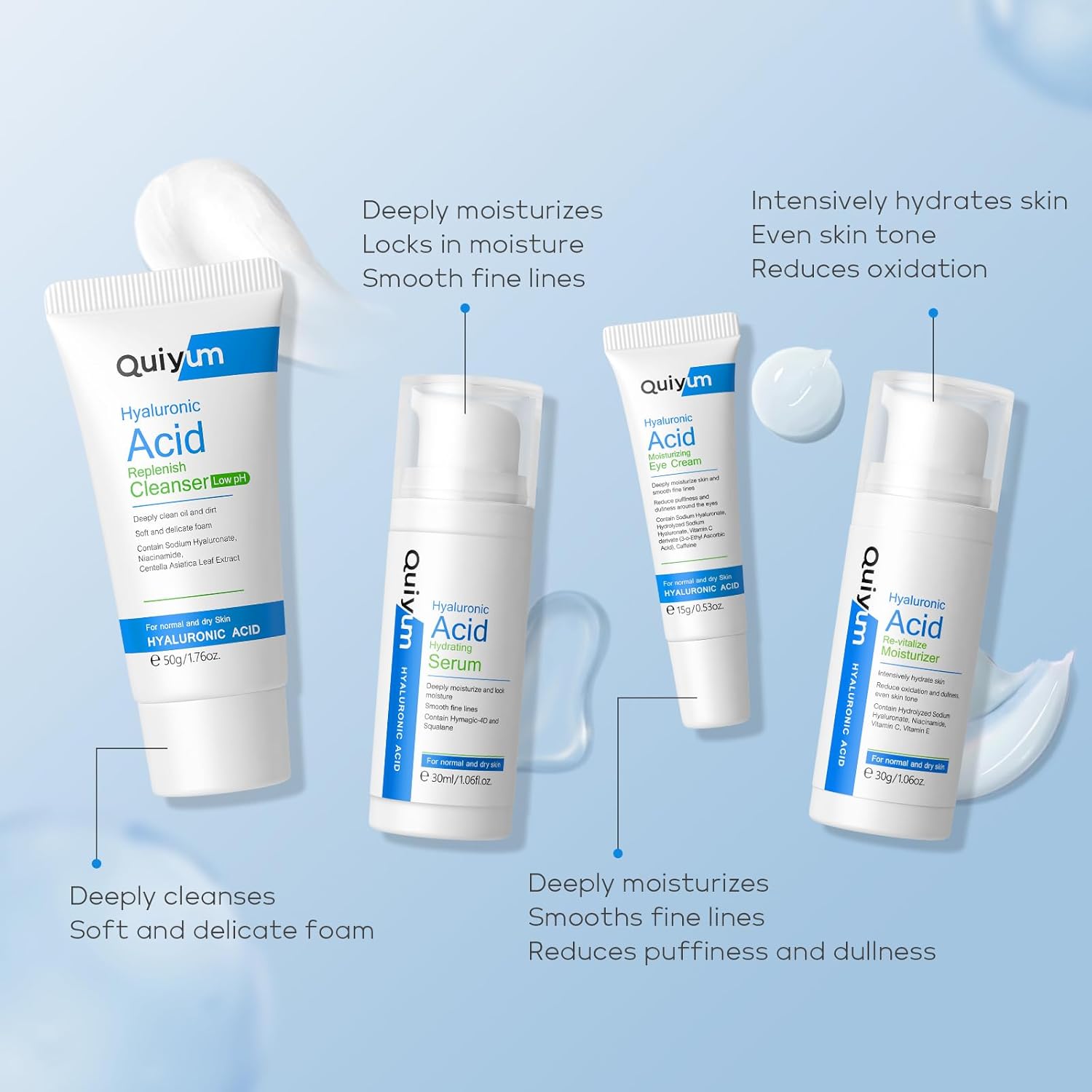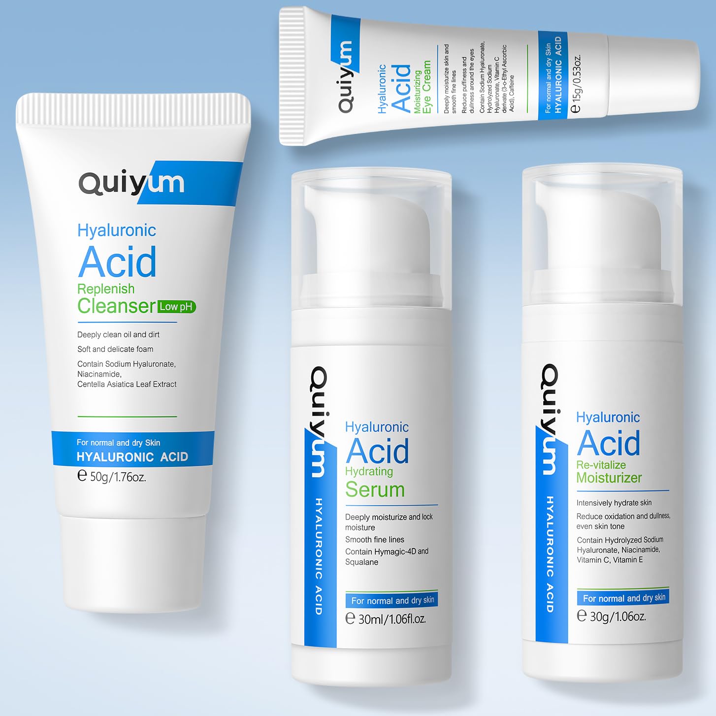 - 【Complete Hydration】Experience flawless hydration with the Quiyum Hyaluronic Acid Skin Care Set, expertly crafted for women and teen girls. Specifically designed to repair and rejuvenate, Quiyum Hydrating Skin Care Set addresses skin dryness and peeling caused by dehydration. It includes Low pH Cleanser, Moisturizer, Serum, and Eye Cream to deeply hydrate and combat signs of aging.
