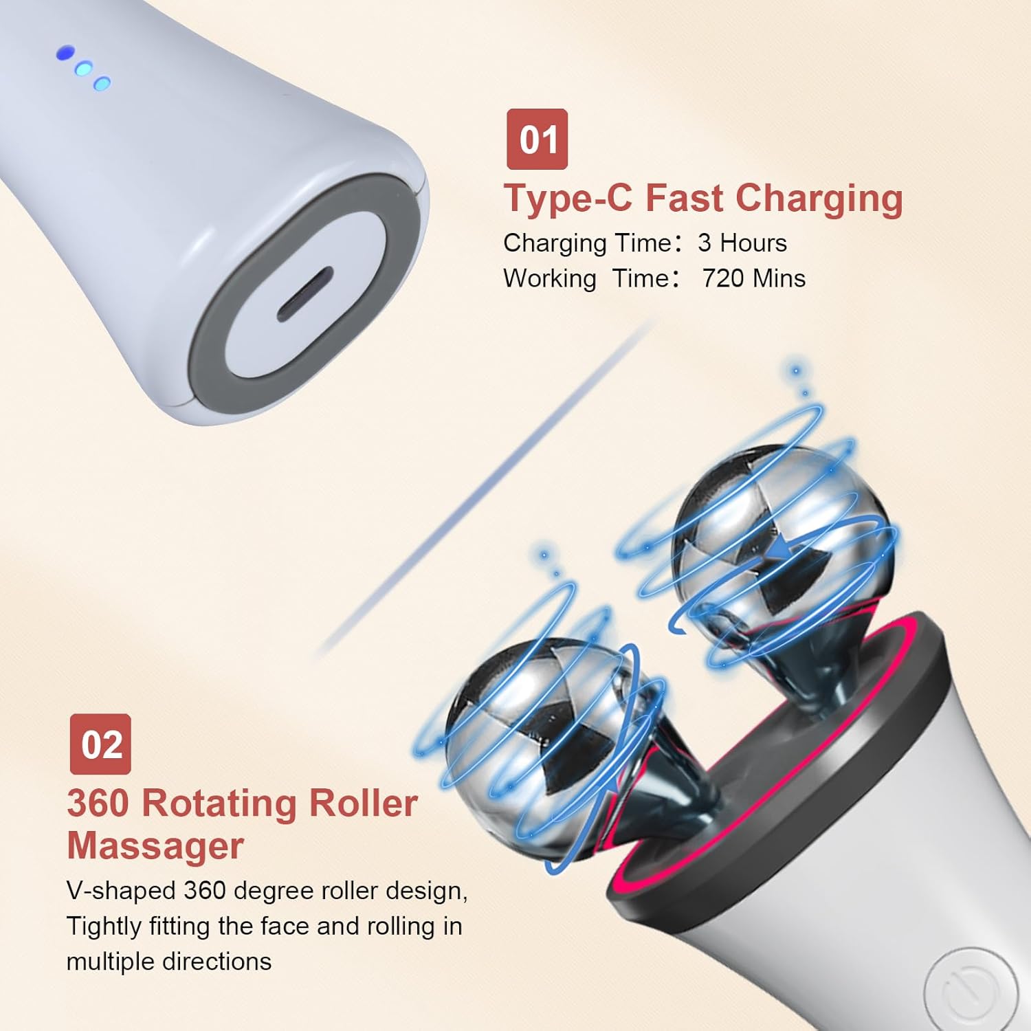 - 【Special Design】It contains two massage balls that can rotate 360°, and the LED aperture will light up when used. There are 6 gears, Press and hold for 2 seconds to power on, you can adjust according to the strength you want, and the effect will be better with moisturizing cream or face cream.