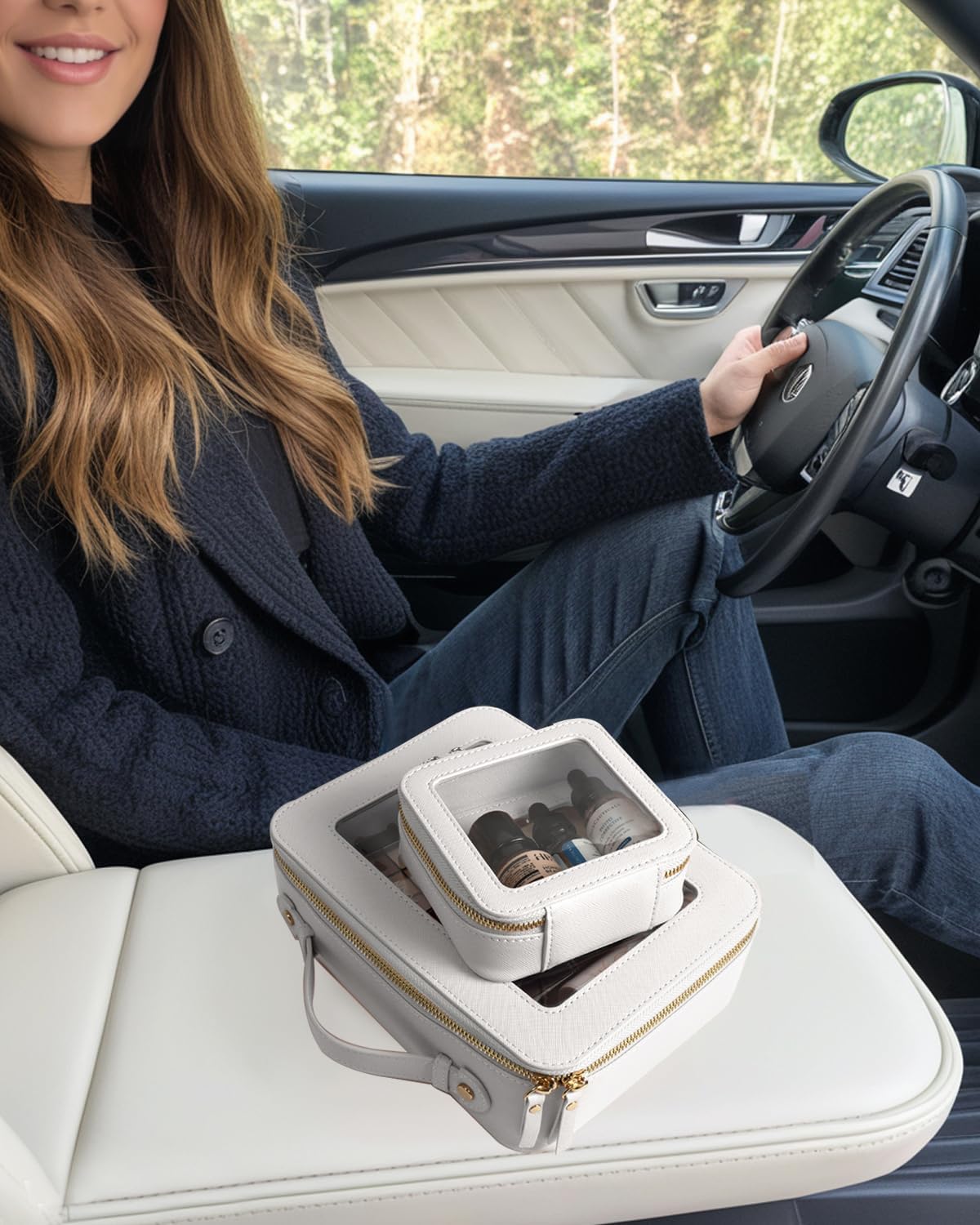 • Clear Design: Our clear toiletry bag set is sleek and minimalistic look for your makeup accessories collection. And is designed with a clear PVC window,all items are clear at a glance, and you can quickly choose the cosmetics you need. Large: 9.44“ x 6.1” x 2.7”, Mini: 5'' x 4.7'' x 2''