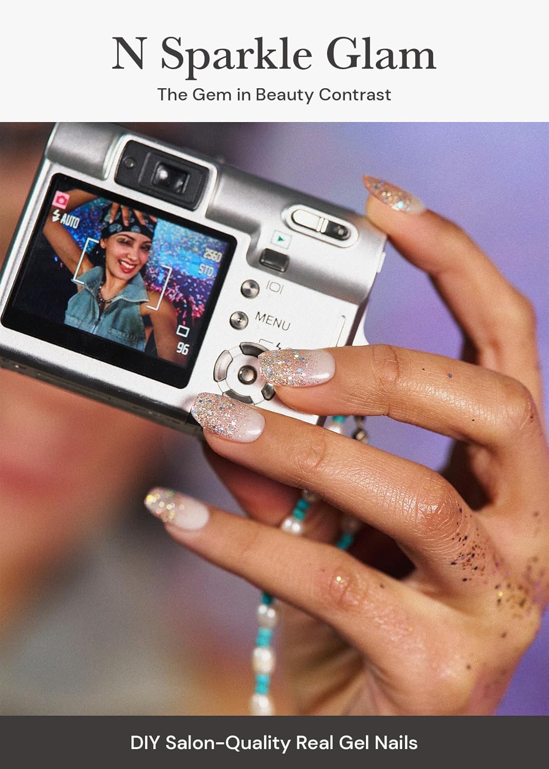 ohora Semi Cured Gel Nail Strips (N Sparkle Glam) - Nude, Glitter, Works with Any UV/LED Lamps, Salon-Quality, Long Lasting, Easy to Apply & Remove - Includes 2 Prep Pads, Nail File & Wooden Stick