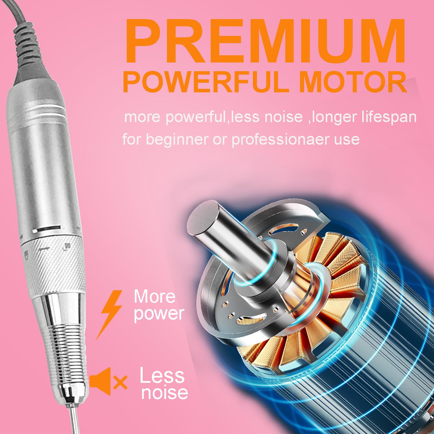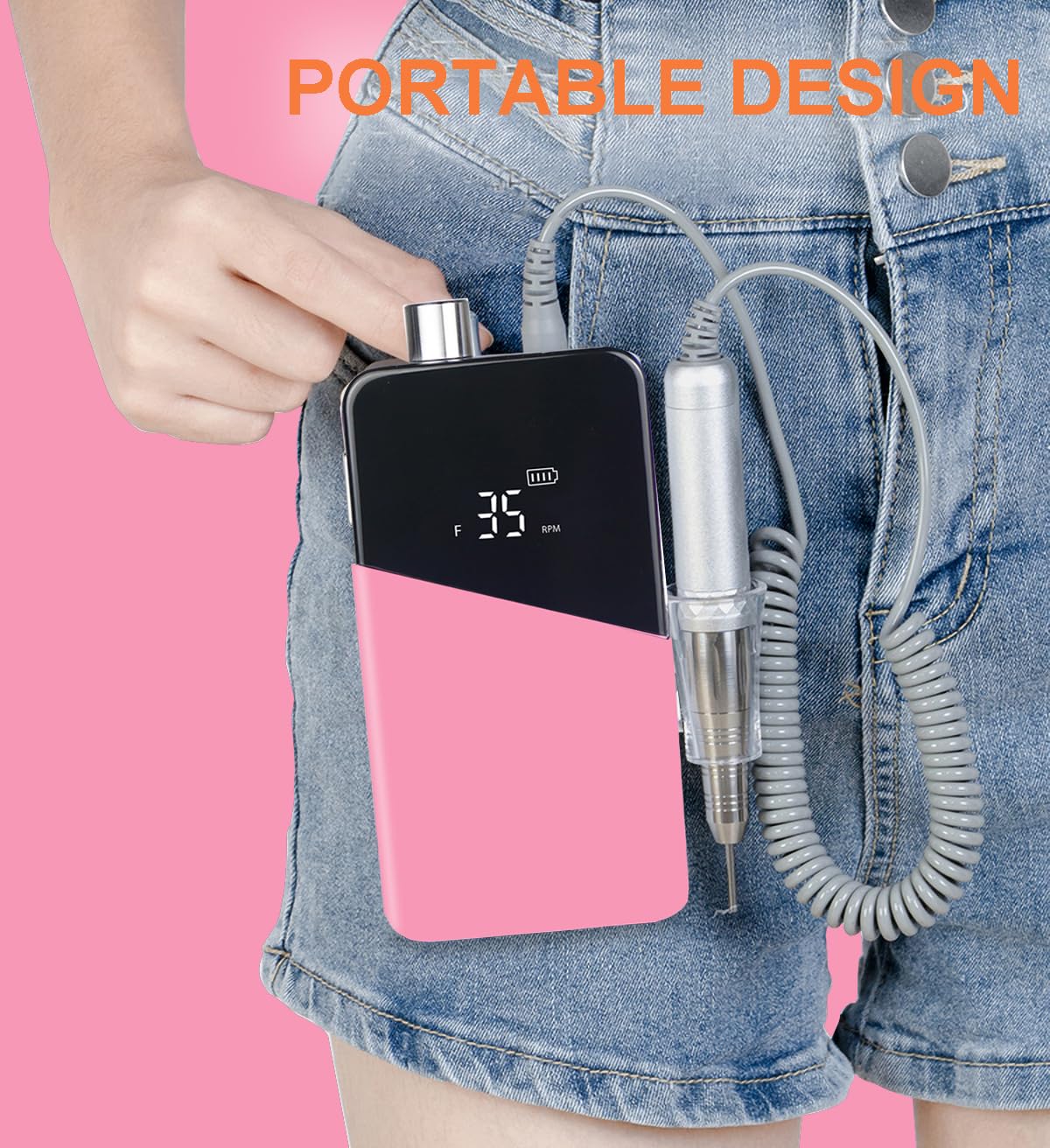 Professional Cordless Nail Drill Machine - Rechargeable Electric Nail File, 35,000 RPM Efile for Acrylic Gel Nails, Pedicure & Manicure Tools with LCD Screen, 13 Drill Bits (Pink)