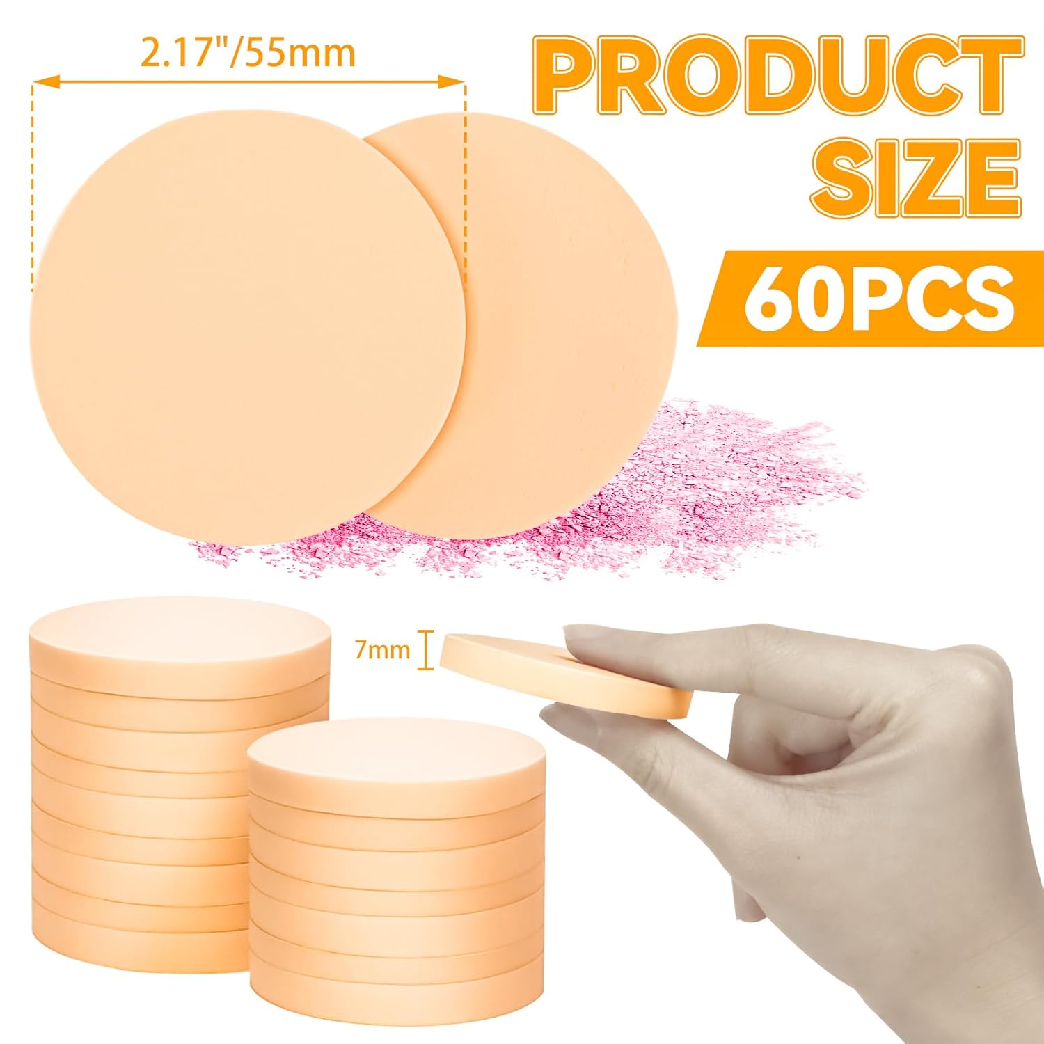 - Size: These makeup sponges for foundation are approximately 2.17"/55mm in diameter and 0.28"/7mm thick, lightweight and easy to carry around