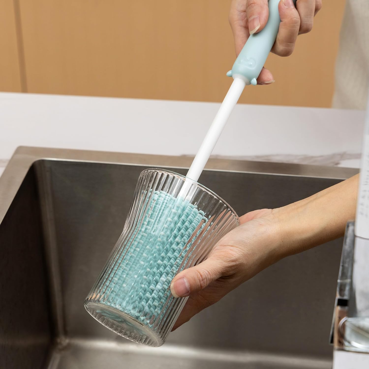 - The ergonomic, non-slip handle of bottle brush for cleaning always ensures a secure grip. Brushes are soft and flexible, keep the water glass clean without leaving any scratches.