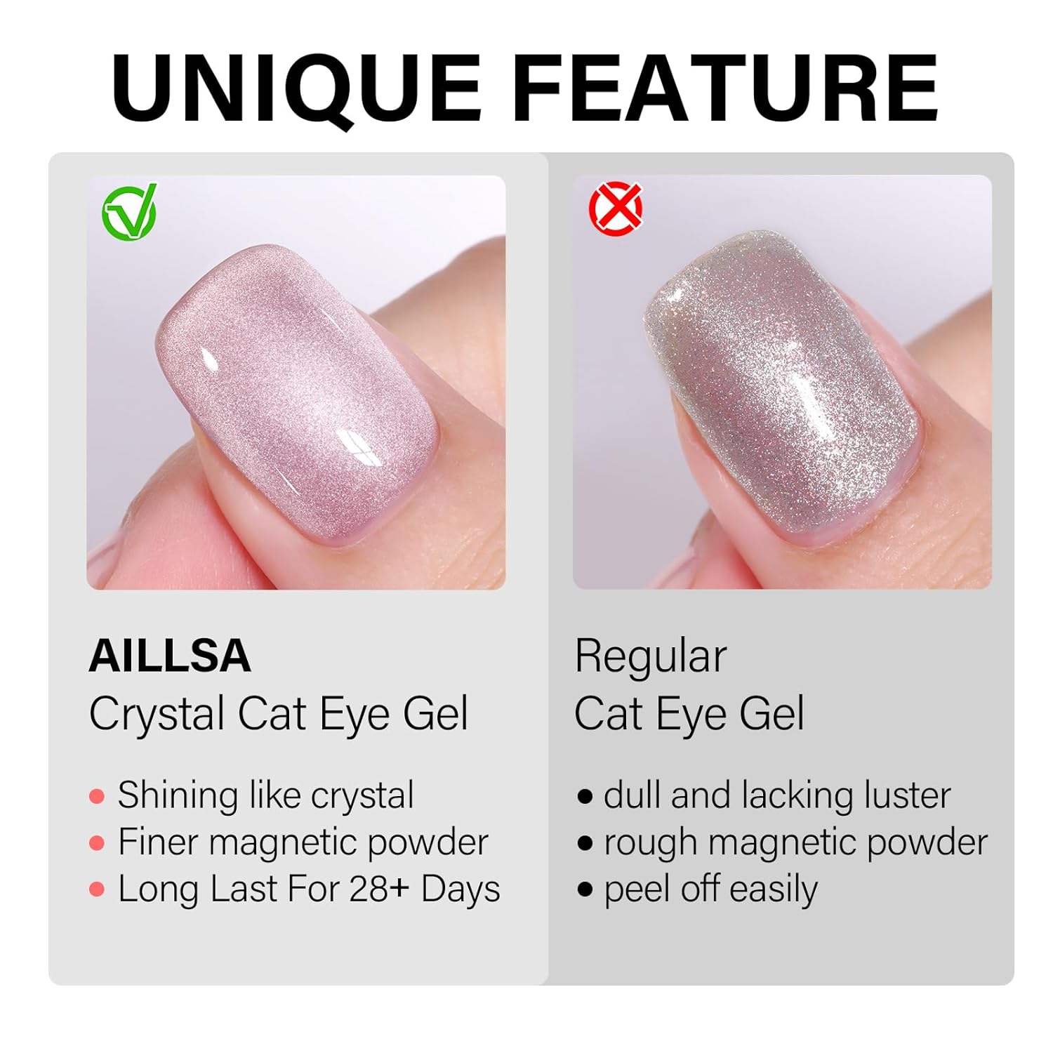 - CRYSTAL SPARKLING EFFECT - AILLSA Cat Eye Gel Nail Polish has a dense magnetic powder that can be used alone for a mirror-shimmering, crystal-clear manicure or with any base color nail polish, jelly gel nail polish, and other nail polishes.