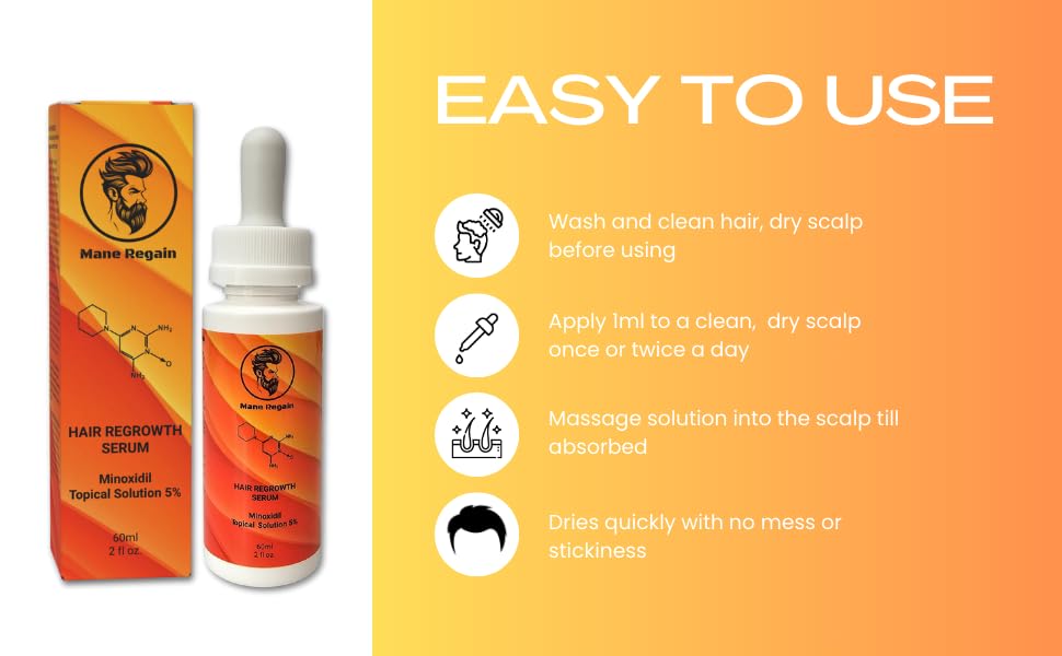 - EXTRA STRENGTH: Mane Regain Minoxidil Topical Solution USP, 5 Percent is an extra strength solution for men to help regrow hair; includes an easy to use dropper