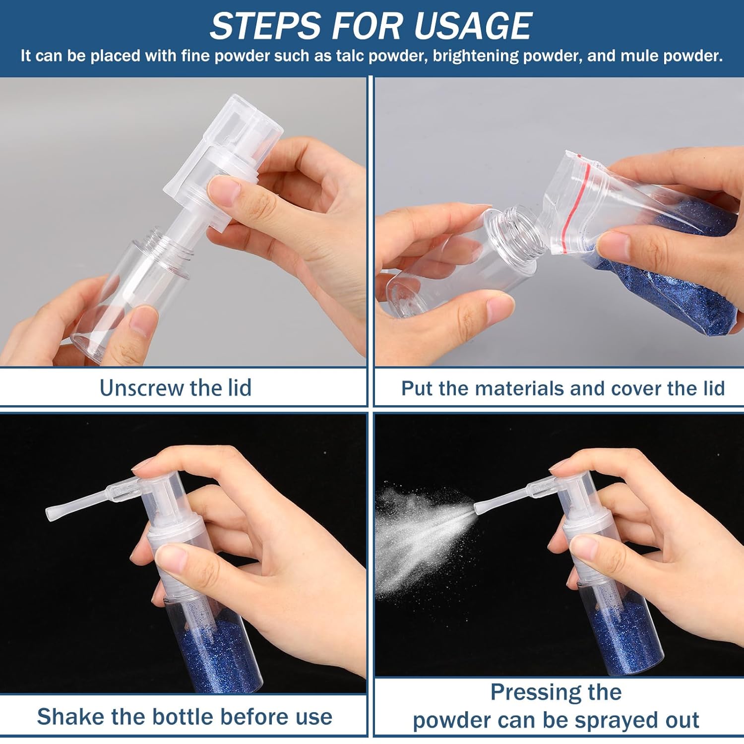 - 【Wide range of applications】 This powder spray bottle can be used to spray most fine powdered substances, such as daily glitter powder, dry cleaning shampoo powder, children's talcum powder, facial care powder, deodorant powder, seasoning powder, etc., which can be widely used in makeup, handicrafts, cake decoration, clothes, nails, daily home, etc.