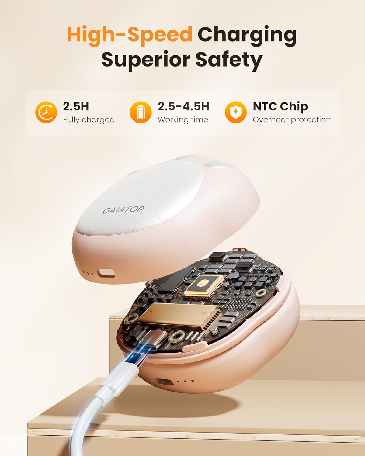 - Long Battery Life: The hand warmers rechargeable lasts for 2.5-4.5 h and fully charged within 2.5 h; Comes with 2 cables so they for charging at the same time; The LED lights are easy to read and tell you what heat level the portable hand warmer is on
