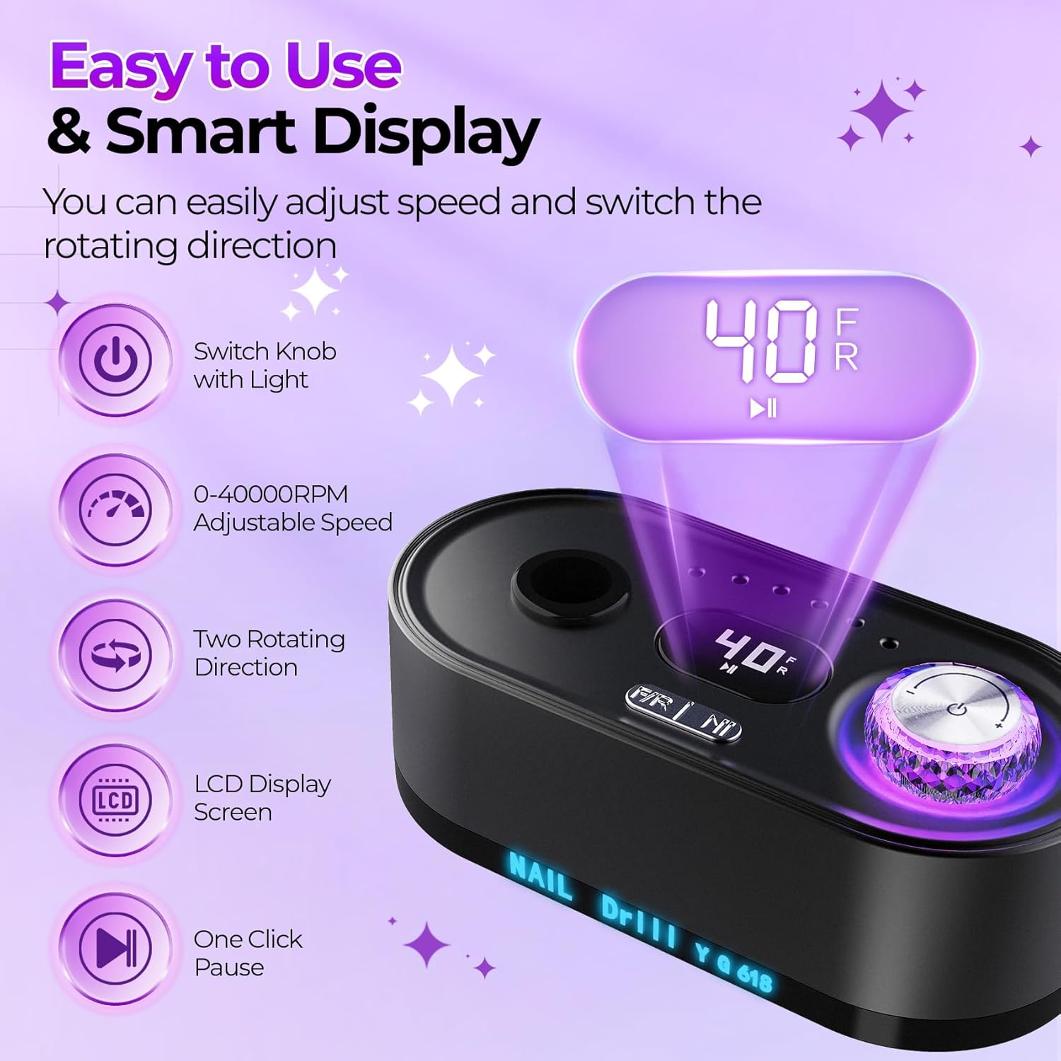 - More Powerful and Stable Electric Nail Drill: The GOLEEXU electric nail file is perfect for various nail care tasks. The speed can be as high as 40,000 RPM, you can adjust the speed with precision by simply rotating it easily. From pre-care to removal and shaping, it handles nail extensions, gel polish, tips and dead skin