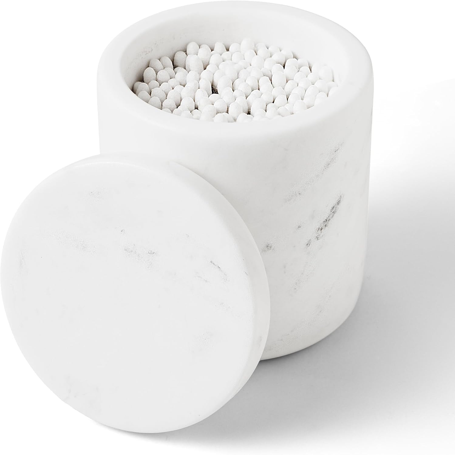 - Solid Natural Marble: Crafted from luxurious Italian marble,WORHE cotton ball holder with lid is not only sturdy and heavy-duty but also exudes timeless elegance. Its natural marble composition ensures stability and a sleek appearance that complements any bathroom decor