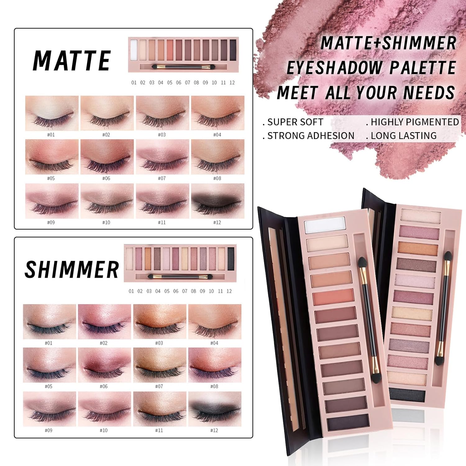 - [Makeup Set] The Christmas makeup gift set for women includes Matte & Shimmer 12 Colors Eyeshadow Palette, Full Coverage Nude & Buff Beige Foundation, 3pcs Liquid Lipsticks, Face Primer, Highlighter & Contour & Blusher 3 in 1 Makeup Palette, Waterproof Cosmetic Bag, Eyebrow Soap set, Dual-ended Eyebrow Pencil, Winged Eyeliner Stamp, Waterproof Mascara, Makeup Brush & 2pcs Makeup Sponges. It can meet all the beginners’ or professional makeup artists’ needs for daily makeup.
