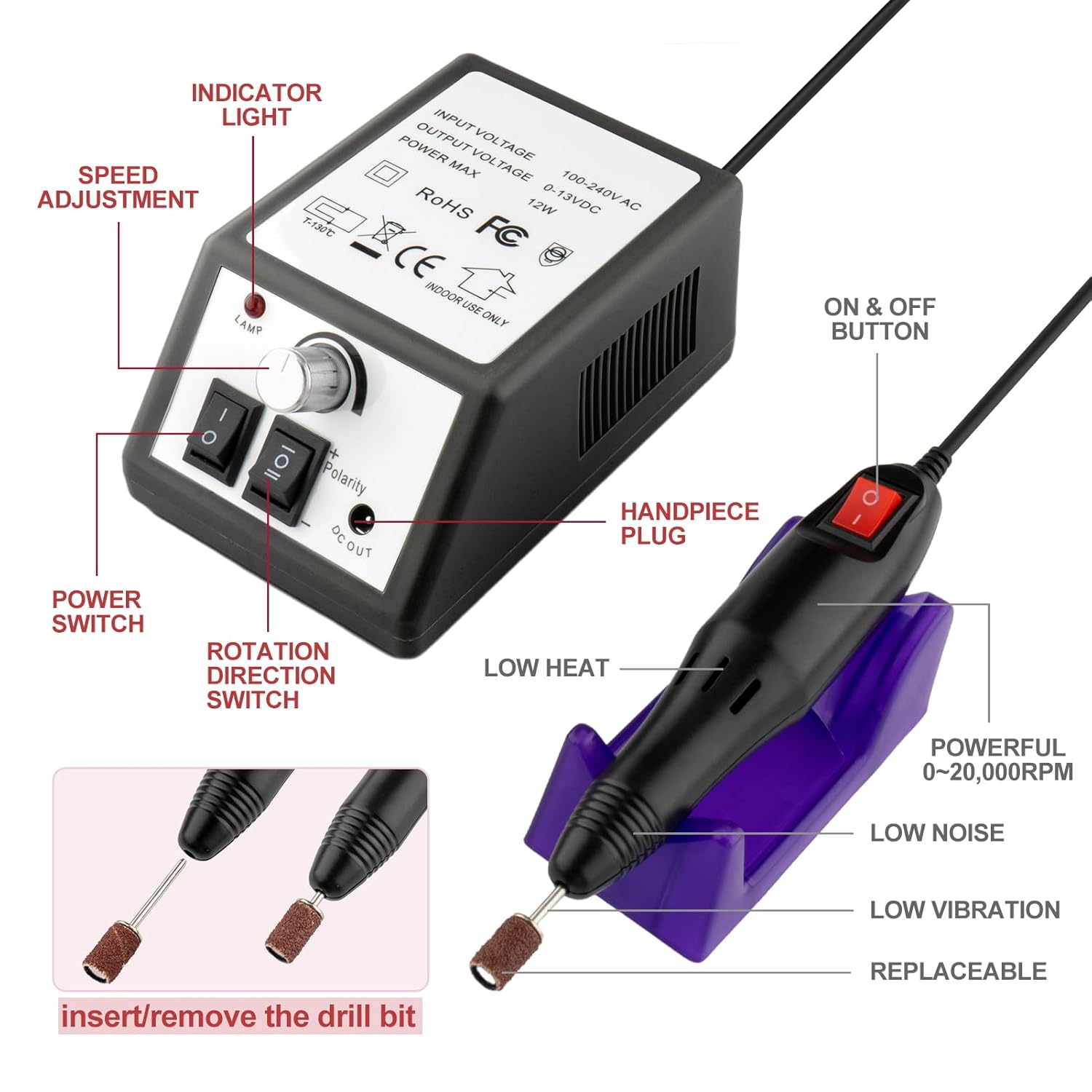 - 【Adjustable Speed】Speed up to 20,000 RPM with a speed control knob, you can easily adjust the speed precision. Forward and Reverse operation. With a speed control Knob, which makes this electric nail file easier and safer to polish your nails.