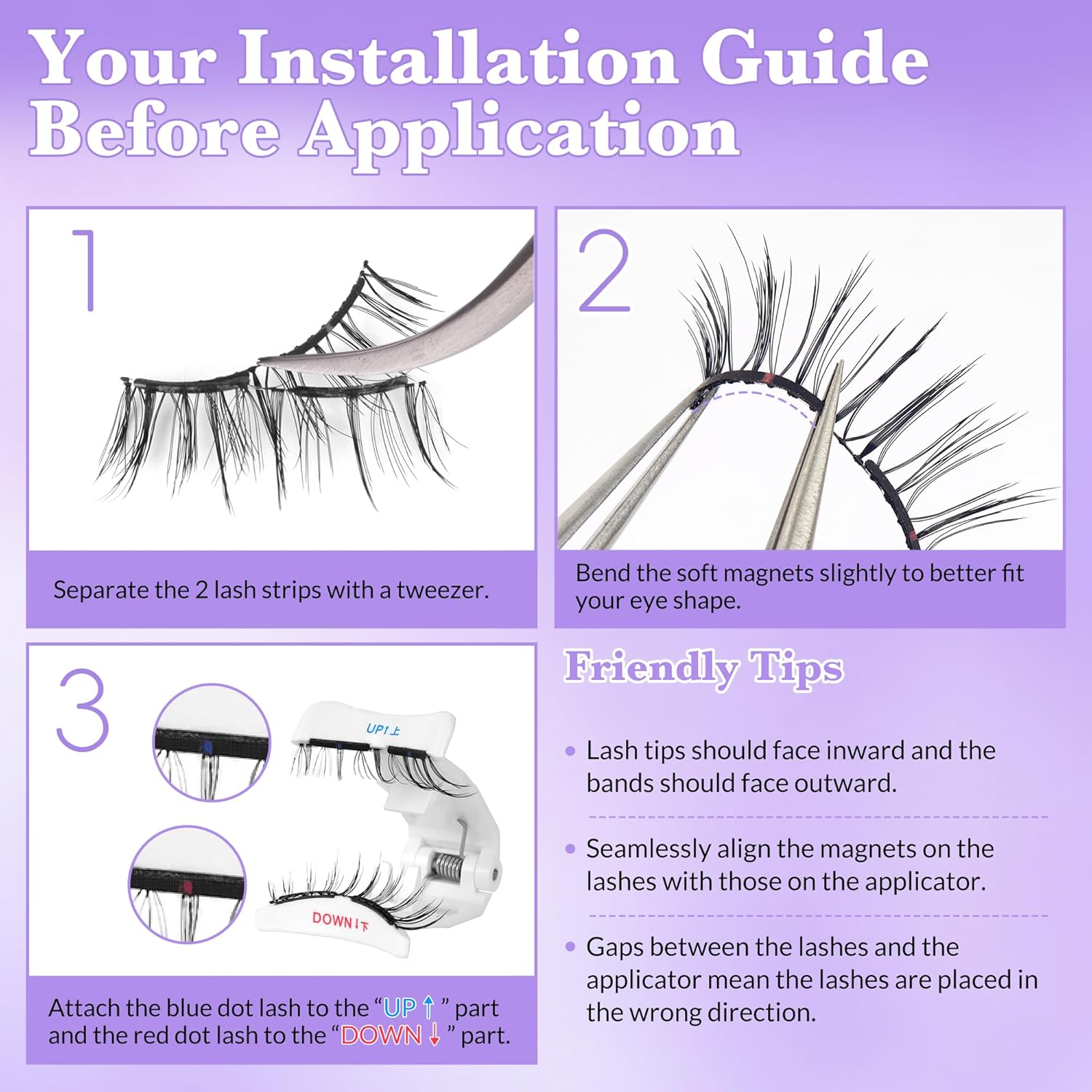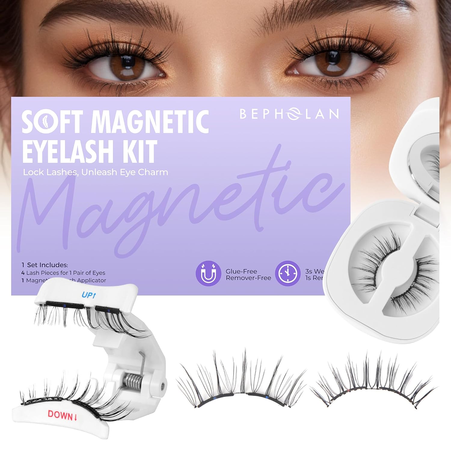 - 【Effortless Use with Soft Magnets】Enjoy a seamless lash journey with our soft magnetic eyelashes. Equipped with 1 pair of 2-magnet lash strips and 1 applicator, you can achieve 3s application and 1s removal, perfect for beginner users