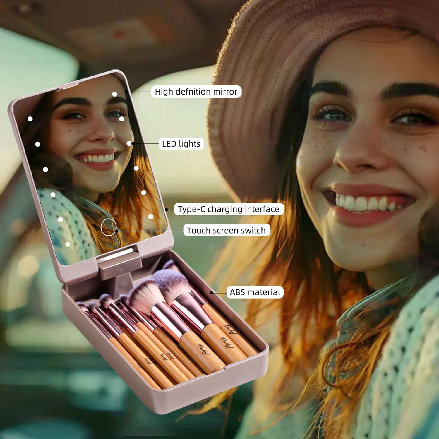 Oneleaf Travel Makeup Brush Set Foundation Powder Concealers Eye Shadows Makeup Set with LED light Mirror 14 Pcs Mini Makeup Brushes (Bamboo)