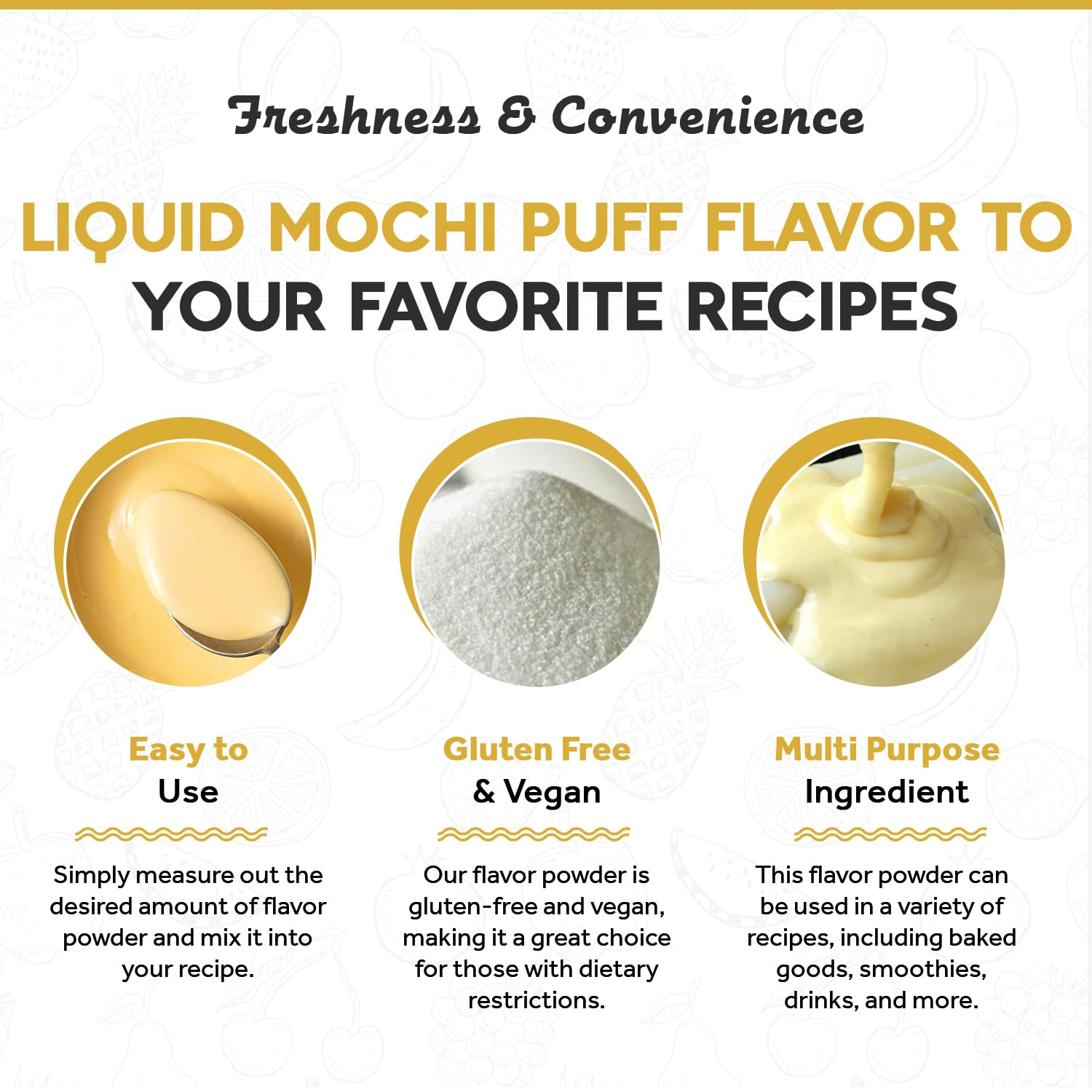 - 𝐄𝐚𝐬𝐲 𝐭𝐨 𝐮𝐬𝐞: Simply measure out the desired amount of Mochi Puff Bubble Tea Flavoring Powder and mix it into your recipe. This powder provides all the nutty flavor you need in a convenient form.