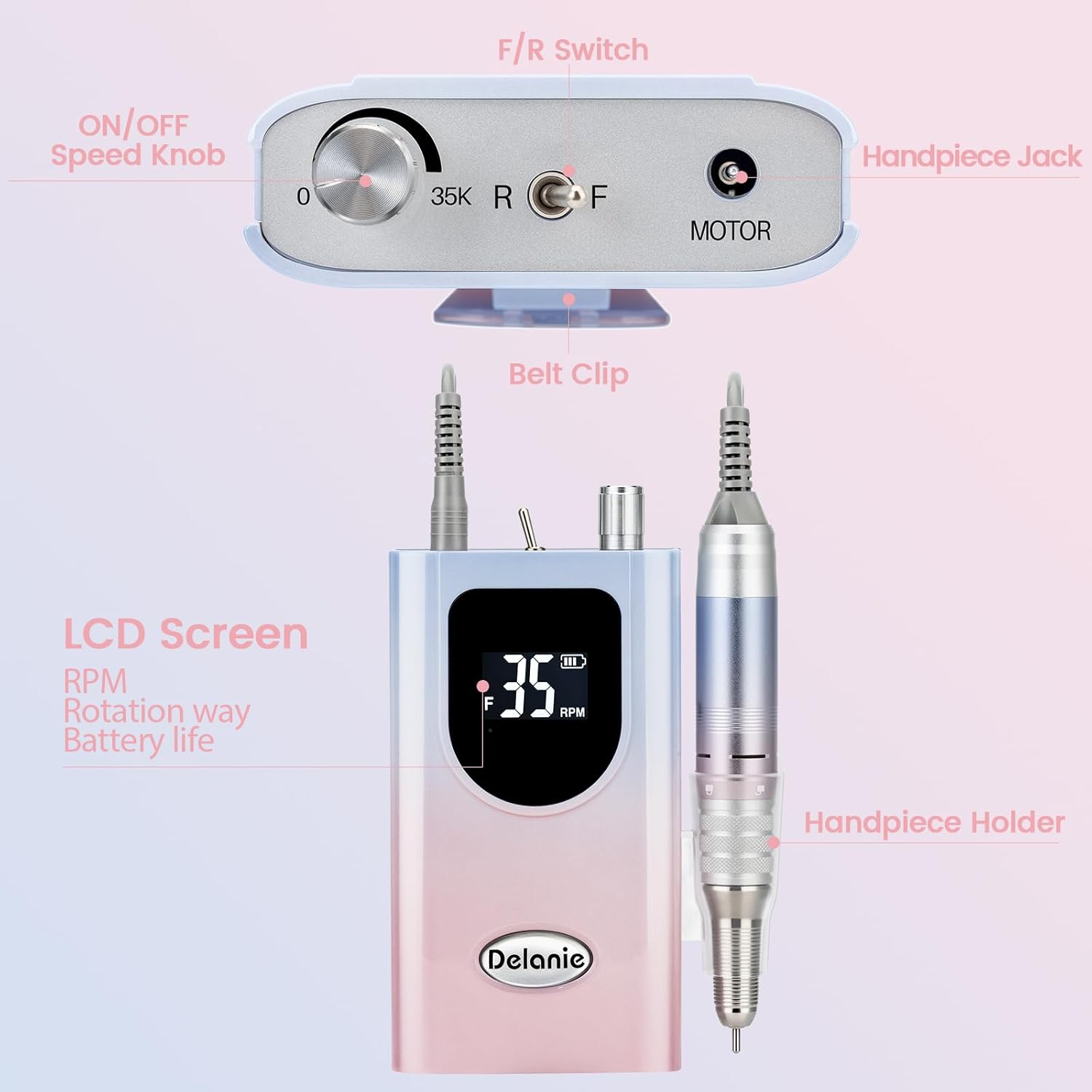 Delanie Professional Nail Drill High Torque 35000 RPM Rechargeable Portable Electric Nail File Filer for Acrylic Gel with Cuticle Bits, Salon Manicure Tool, Gradient Pink