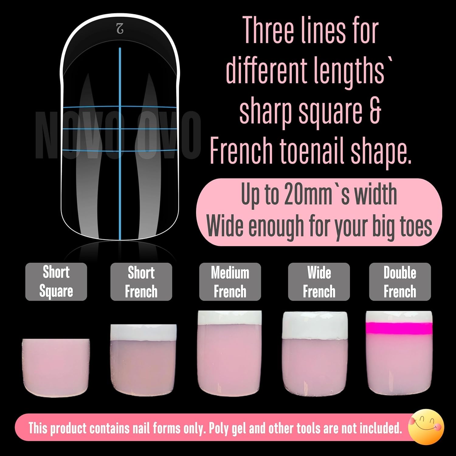 - THE WORLD'S FIRST DUAL FORM FOR TOES: Designed specifically for nail artists and DIY enthusiasts, NOVO OVO proudly presents the world's first toe dual form. Effortlessly build your nails with poly gel inside the dual forms, place them on your toenails, cure, and simply pop them off. This innovative solution is perfect for those with short natural nails or anyone struggling to find the right nail tips.