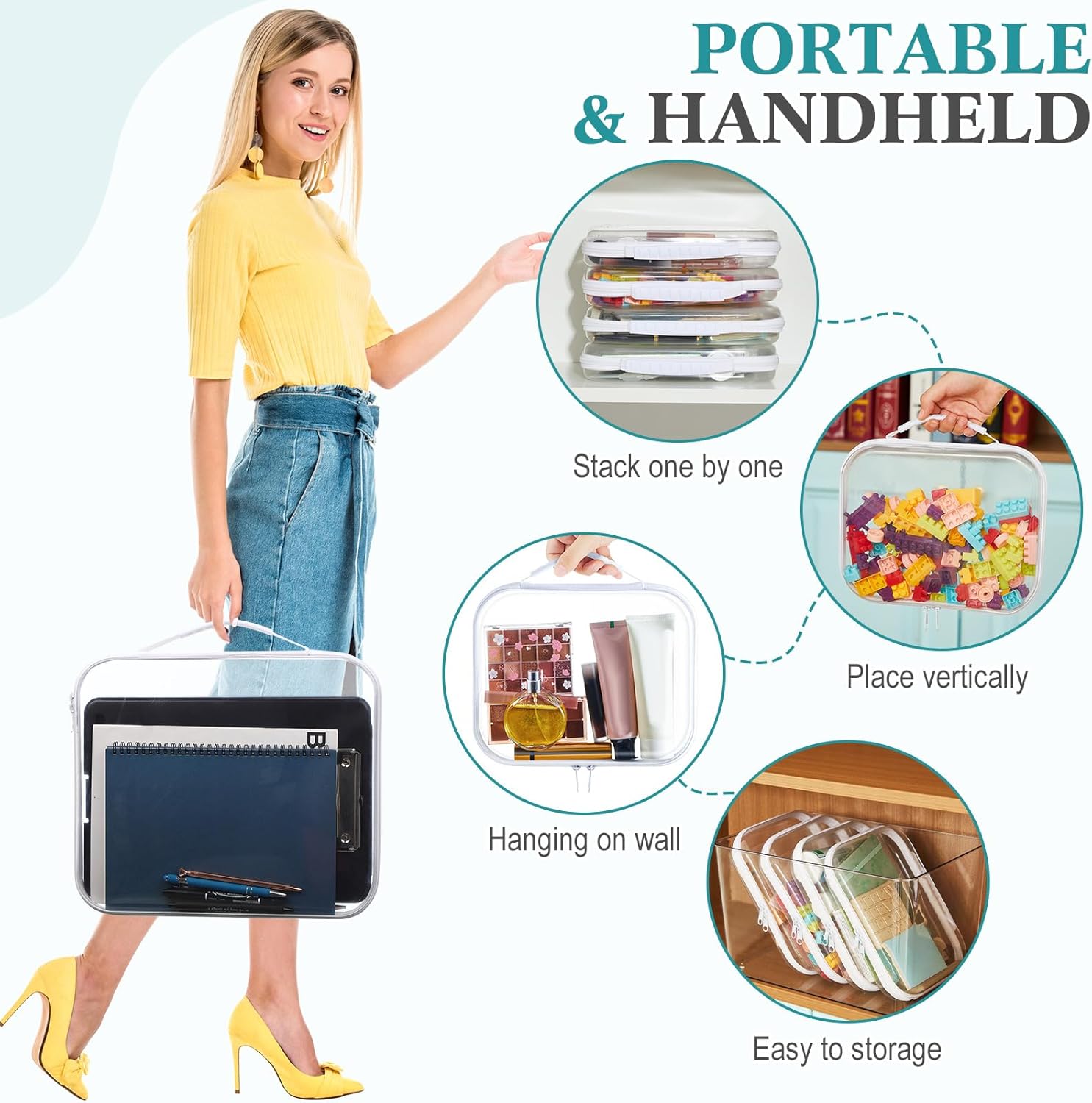 Sanwuta 4 Pcs Clear Hard Zipper Case with Handle Office Storage Cases Hard Plastic Pouches Transparent Bins for Toys, Snacks, Cosmetics, Building Blocks, Puzzles(13.8 x 11.8 x 2 Inches,White)