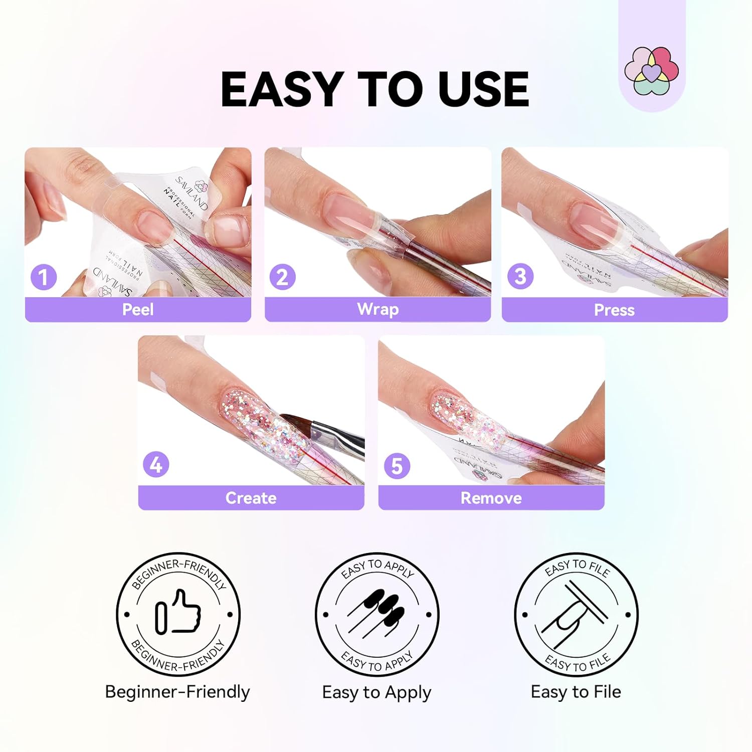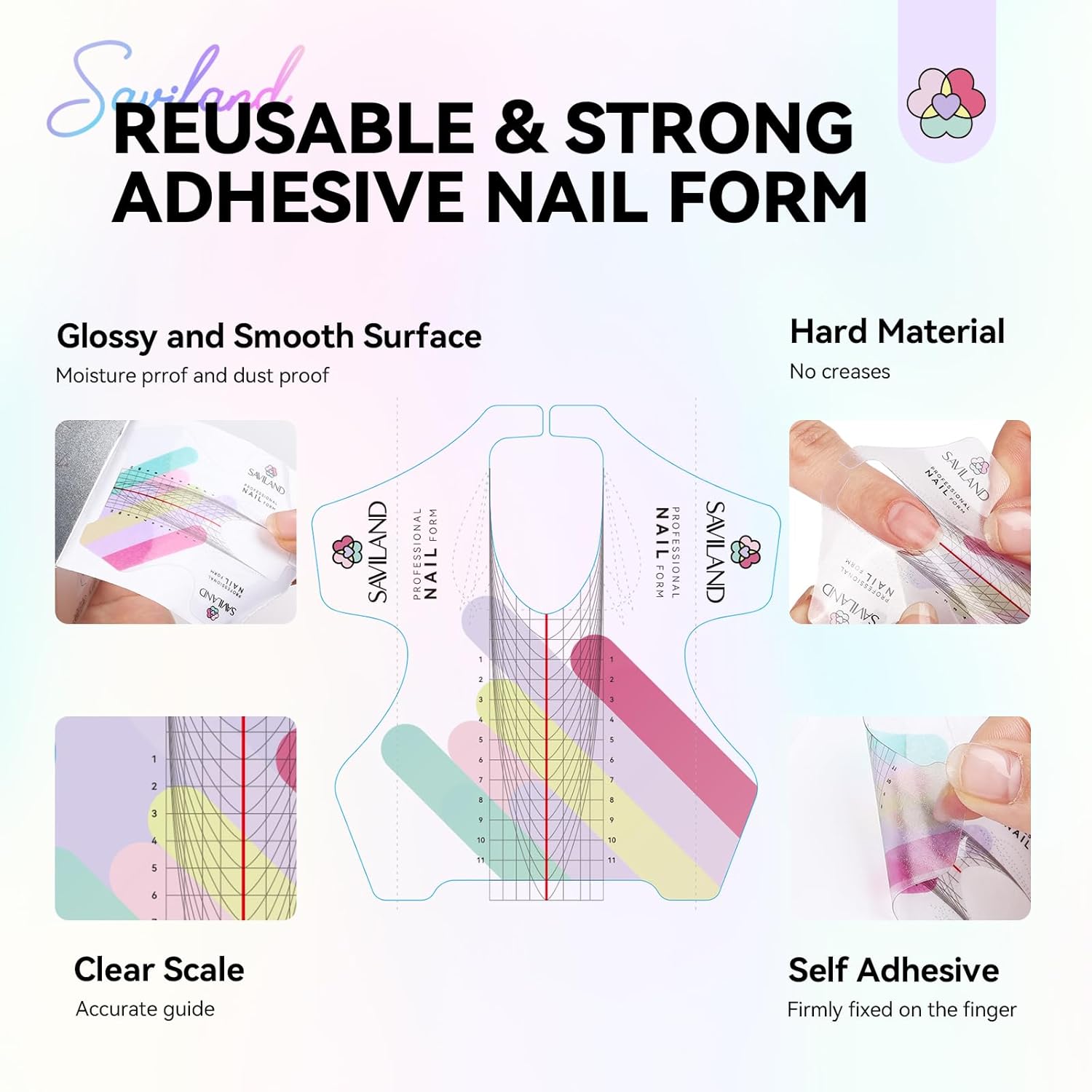 - Reusable Nail Form: SAVILAND Nail Forms feature a glossy laminated surface that not only looks great but also provides moisture and dust protection. Each Nail Form is reusable and offers superior adhesion. With a total of 100 pcs Nail Forms, you can extend nails many times