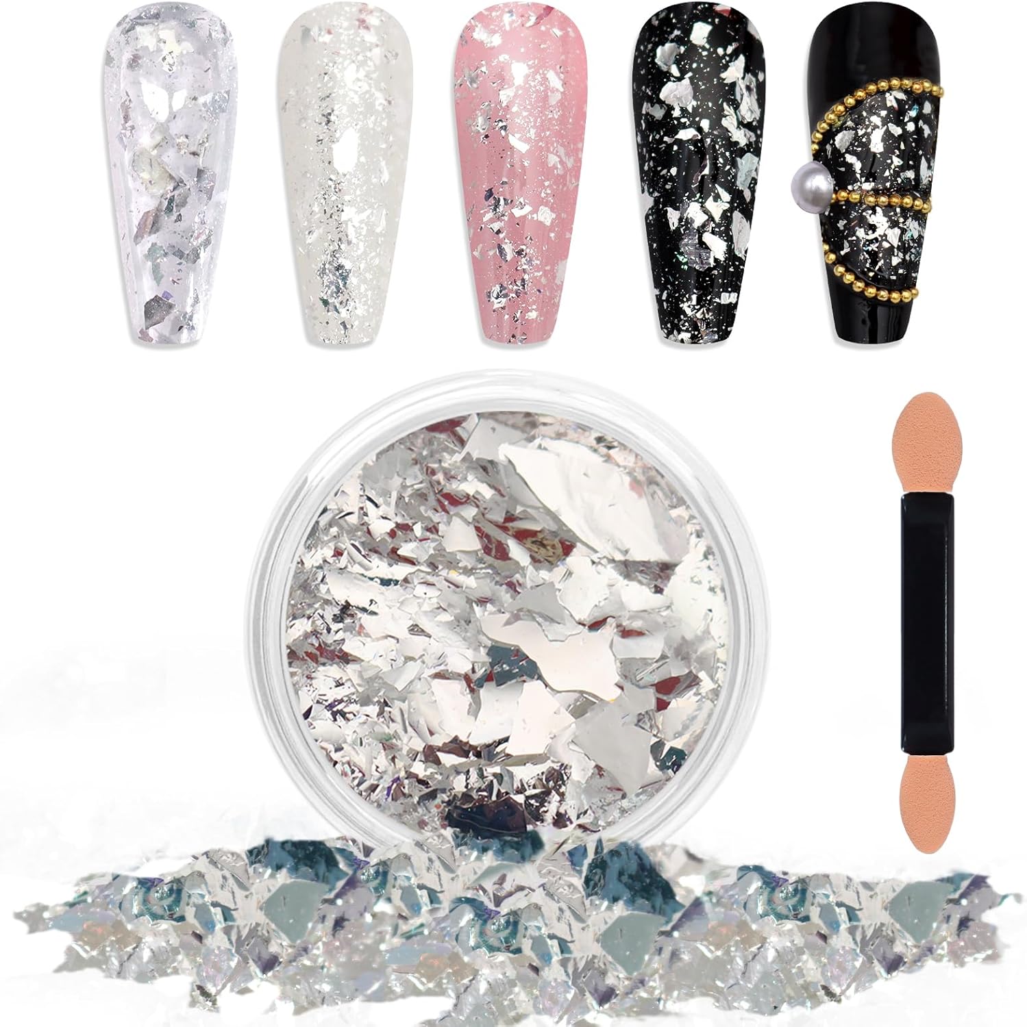 Laza Silver White Pearlescent Nail Flakes Glitter Irregular Opal Nail Foil Flakes Chunky Confetti Moonlight Chrome Sequins Aurora Fairy Dust for Mermaid Nails Design, Nail Decorations for Nail Art