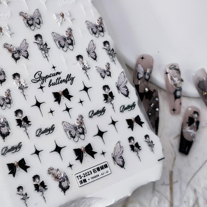 - Black White Nail Art Decals: 1 sheets of 5D embossing carving patterns nail stickers give you an advanced exquisite feeling. These intricate designs feature butterfly, bowknots, roses, and twinkling in stunning 4 relief, suitable for decorations for your nails, adding a touch of magic to nail art design
