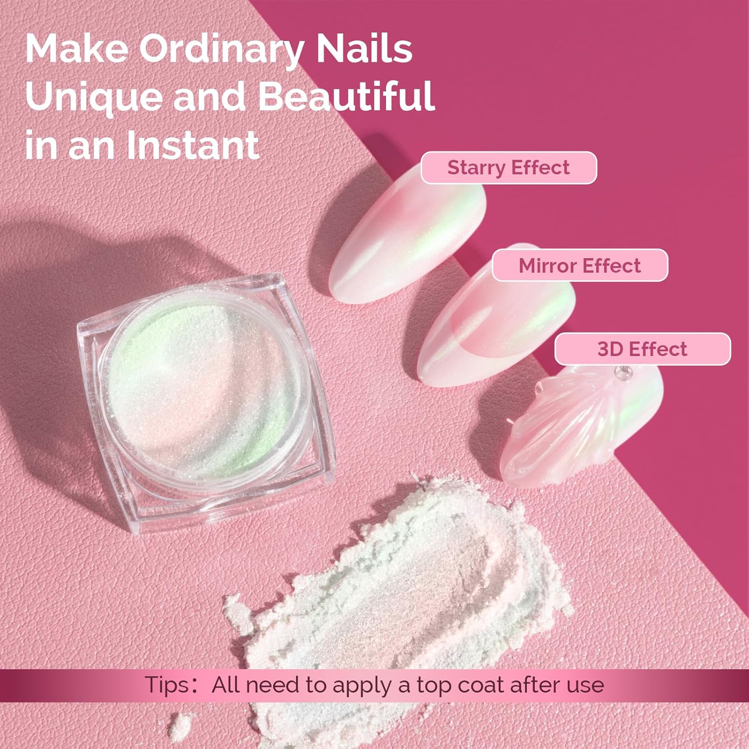 - Easy to Carry: Stylish and compact size, easy to store and carry, save space in your makeup bag, easy to carry around, for home and professional use.When opening and applying nail mirror powder, keep it away from your eyes to avoid irritation. If powder gets into your eyes, rinse immediately with clean water. Use gentle motions, and consider wearing protective eyewear for safe application