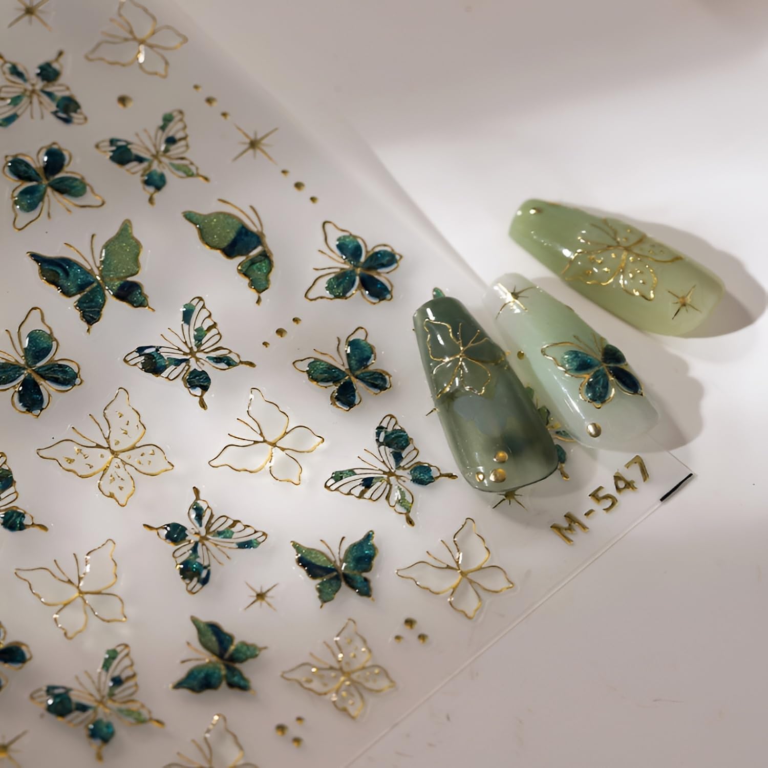 Green Butterfly Nail Stickers for Nail Art 5D Embossed Nail Decals Gold Butterfly Nail Art Stickers Cute Nail Supplies for DIY Manicure Self Adhesive Nails Design for Women
