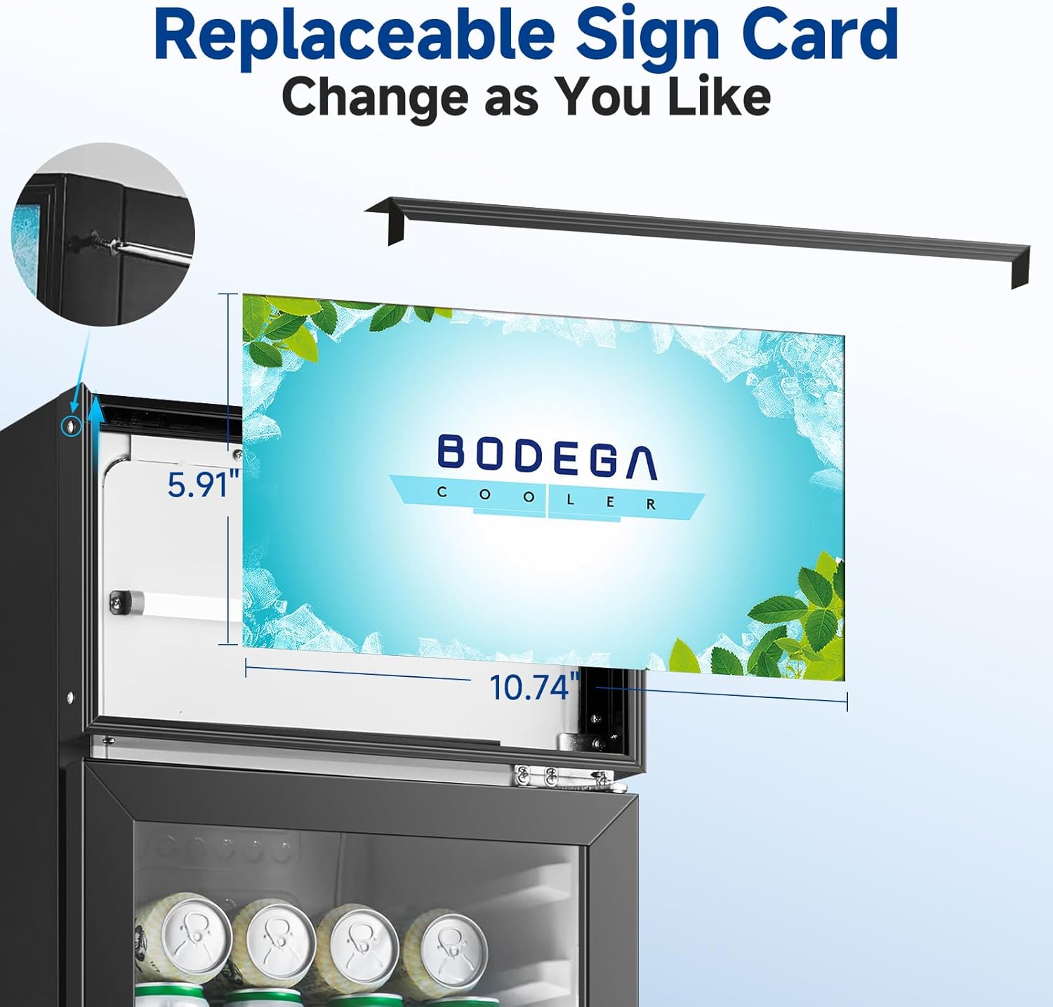 - [Replaceable Light Box Signage Cards] This commerical cooler not only boasts excellent cooling performance, but also comes with an advanced lighting system that includes a light box and a white LED light strip. The lightbox is ingeniously designed, allowing for easy replacement of the signage card by removing screws on both sides. This feature enables you to easily change the signage cards according to the needs of your shop to emphasise your shop's professional image, to promote special events or to create a unique festive atmosphere.