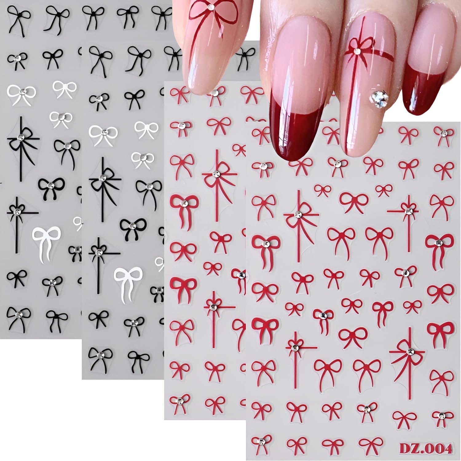 4 Sheets Bow Nail Stickers, 5D Embossed White Black Red, DIY Acrylic Nails, Bow Nail Supplies for Women