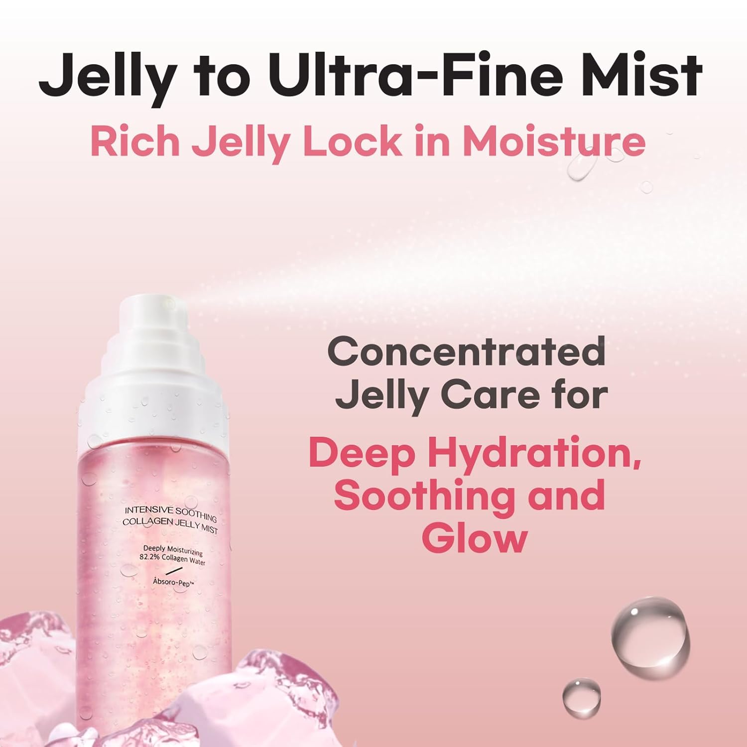 - Dewy & Glow : Formulated with 82.2% Vegan Collagen Water and 16 types of Hyaluronic Acids, this mist transforms from a jelly to a ultra-fine mist texture, delivering a more abundant dose of moisture. It instantly soothes dry, tired skin while restoring elasticity, plumping and radiance without any heaviness.