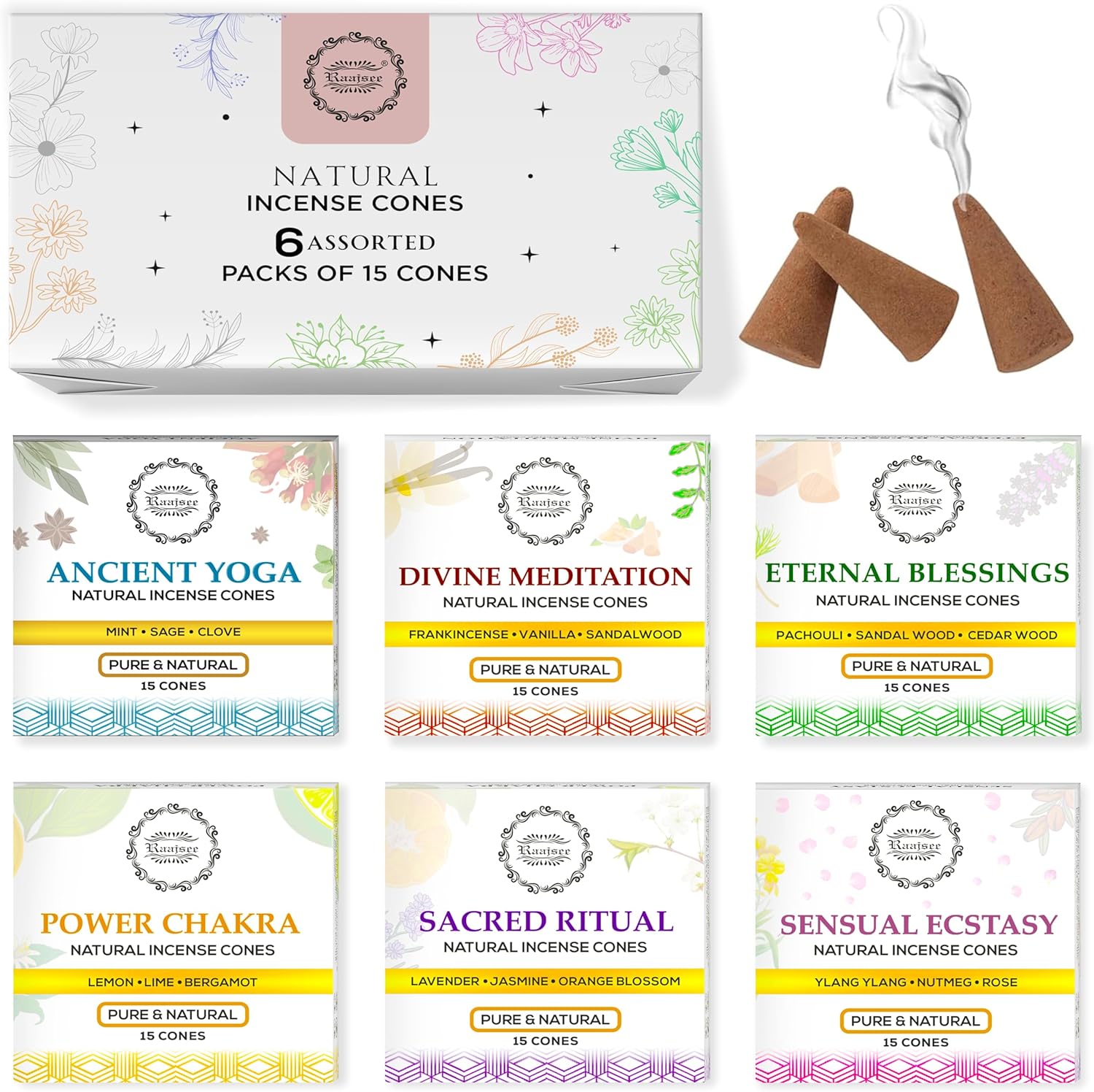 Raajsee Natural Incense Cones,6 Pack Mixed Scents Gift Pack 15 pc Each (90 Total), Insense Cones Variety Pack, 100% Organic Non Toxic Natural - Hand Rolled Free from Chemicals (Pack 3)