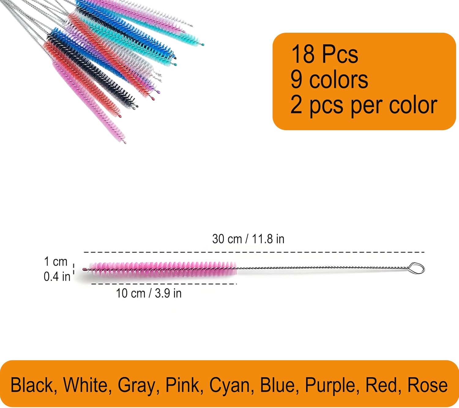 - 1. Includes: 18 pcs, 9 colors, 2 pcs per color, single size: total length 11.8in/30cm, brush head length 0.39in/10cm, brush head diameter 1cm, handle diameter 0.16cm, different colors, family members use them separately, suitable for people who are good at color-savvy