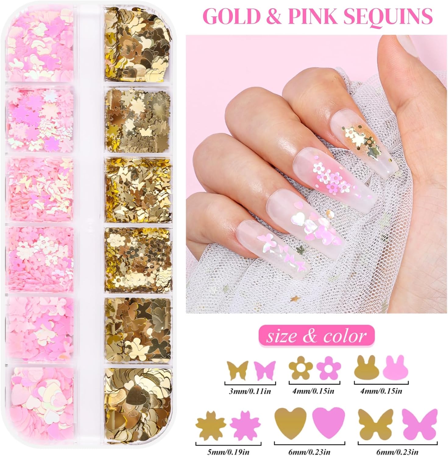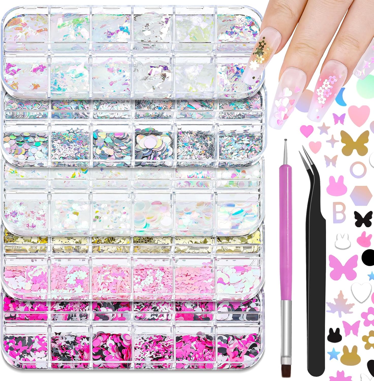 - Nail Sequins Decoration Kit: You'll get 5 boxes of mixed-shaped sequins (butterflies, hearts, stars, moons, flowers, diamonds, etc.), 1 pair of precision tweezers, and 1 pc of dual-end nail brush/dotting pen—everything you need for stunning nail art!