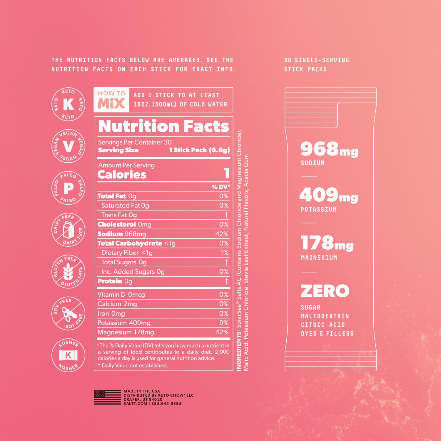 Keto Chow SALTT Electrolytes Powder Packets, Fruit Variety Pack (30 Packets) - Magnesium, Potassium, Sodium, Trace Minerals - Vegan, Sugar Free, Gluten Free - Travel Essentials - Made in USA