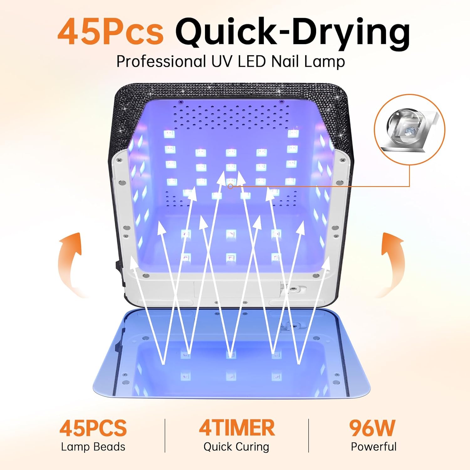 - 【Efficient Quick Drying】With 45 dual light source lamp beads, this uv LED nail lamp expertly cures all types of nail gel brands, including Base Coat, Top Coat, Color Gel, Hard Gels, Poly Gels, Builder, Acrylic, Sculpture gel, and gem glue in no time. Say goodbye to harsh lights that can harm your eyes and hands and hello to top-notch salon manicures from the comfort of your own home